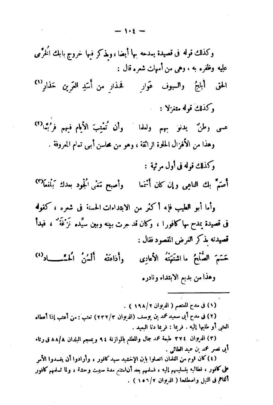 وأما أبو الطيب فإنه أكثر من الابتداءات الحسنة في شعره، كقوله في قصيدة يمدح بها كافورا، وكان قد جرت بينه وبين ابن سيده نزغة، فبدأ قصيدته بذكر الغرض المقصود فقال: