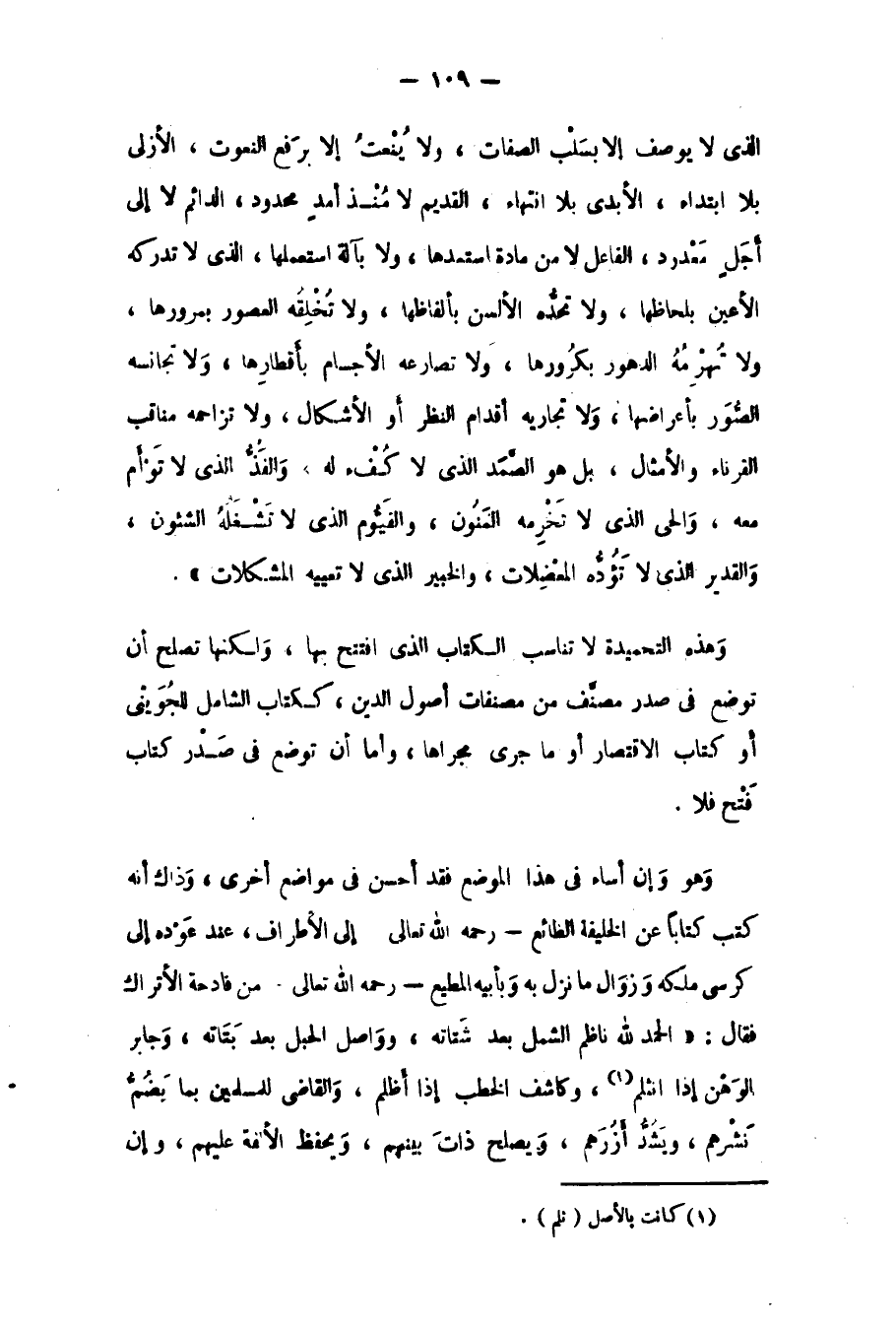 الذي لا يوصف إلا بسلب الصفات، ولا ينعت إلا برفع النعوت، الأزلي بلا ابتداء الأبدي بلا انتهاء، القديم لا منذ أمد محدود، الدائم لا إلى أجل معدود، الفاعل لا من مادة استمدها, ولا بآلة استعملها، الذي لا تدركه الأعين بلحاظها، ولا تحده الألسن بألفاظها، ولا تخلقه العصور بمرورها، ولا تهرمه الدهور بكرورها، ولا تصارعه الأجسام بأقطارها، ولا تجانسه الصور بأعراضها، ولا تجاريه أقدام النظر أو الأشكال، ولا تزاحمه مناقب القرناء والأمثال، بل هو الصمد الذي لا كفء له، والفذ الذي لا توأم معه، والحي الذي لا تخرمه المنون، والقيوم الذي لا تشغله الشئون، والقدير الذي لا تؤده المعضلات، والخبير الذي لا تعييه المشكلات".
