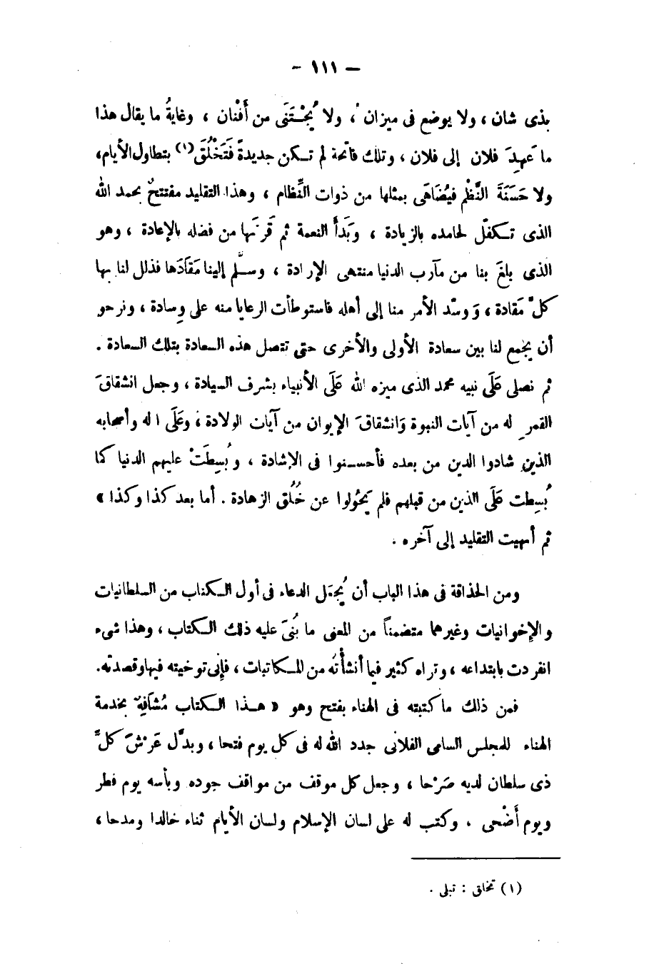 بذي شأن، ولا يوضع في ميزان، ولا يجتنى من أفنان، وغاية ما يقال: هذا ما عهد فلان إلى فلان، وتلك فاتحة لم تكن جديدة فتخلق1 بتطاول الأيام، ولا حسنة النظم فيضاهى بمثلها من ذوات النظام، وهذا التقليد مفتتح بحمد الله الذي تكفل لحامده بالزيادة، وبدأ النعمة ثم قرنها من فضله بالإعادة، وهو الذي بلغ بنا من مآرب الدنيا منتهى الإرادة، وسلم إلينا مقادها فذلل لنا بها كل مقادة، ووسد الأمر منا إلى أهله فاستوطأت الرعايا منه على وسادة، ونرجو أن يجمع لنا بين سعادة الأولى والأخرى حتى تتصل هذه السعادة بتلك السعادة، ثم نصلي على نبيه محمد الذي ميزه الله على الأنبياء بشرف السيادة، وجعل انشقاق القمر له من آيات النبوة وانشقاق الإيوان من آيات الولادة، وعلى آله وأصحابه الذين شادوا الدين من بعده فأحسنوا في الإشادة، وبسطت عليهم الدنيا كما بسطت على الذين من قبلهم فلم يحولوا عن خلق الزهادة، أما بعد كذا وكذا"، ثم أنهيت التقليد إلى آخره.