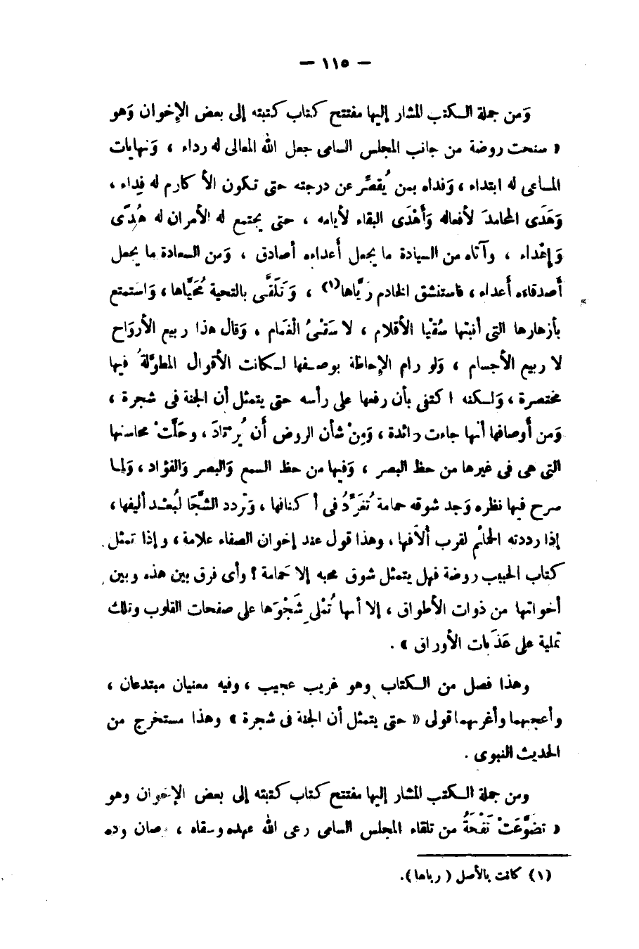 ومن جملة الكتب المشار إليها مفتتح كتاب كتبته إلى بعض الإخوان وهو: "تضوعت نفحة من تلقاء المجلس السامي رعى الله عهده وسقاه، وصان وده