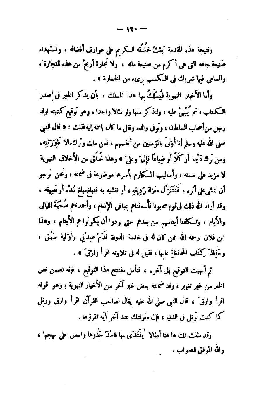وأما الأخبار النبوية فيسلك بها هذا المسلك: بأن يذكر الخبر في صدر الكتاب، ثم يبني عليه, ولنذكر منها ولو مثالا واحدا، وهو توقيع كتبته لولد رجل من أصحاب السلطان, وتوفي والده ونقل ما كان باسمه إليه، فقلت: "قال النبي صلى الله عليه وسلم: "أنا أولى بالمؤمنين من أنفسهم, فمن مات وترك مالا فلورثته, ومن ترك دينا أو كلا أو ضياعا فإلي وعلي" , وهذا خلق من الأخلاق النبوية لا مزيد على حسنه، وأساليب المكارم بأسرها موضوعة في ضمنه، ونحن نرجو أن نمشي على أثره, فنتنزل منزلة رديفه، أو نتشبه به فنبلغ مبلغ مده أو نصيفه، وقد أرانا الله ذلك في قوم صحبونا فأسعفناهم بمباغي الإنعام، وأحمدناهم صحبة الليالي والأيام، وتكلفنا أيتامهم من بعدهم حتى ودوا أن يكونوا هم الأيتام، وهذا فلان ابن فلان رحمه الله ممن كان له في خدمة الدولة قدم صدق، وأولية سبق، وحفظ كتاب المحافظة عليها, فقيل له في تلاوته اقرأ وارق".
