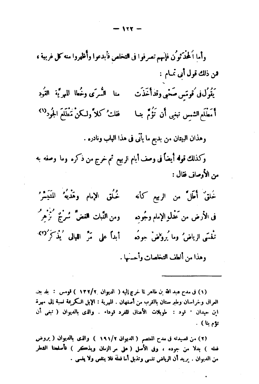 2 من قصيدته في مدح المعتصم "الديوان 2/ 191" والذي بالديوان "يروض فعله" بدلا من جوده، وفي الأصل "على مر الزمان ويذكر" فأصلحنا الشطر من الديوان. يريد أن الرياض تنسى وتذبل أما فعله فلا ينقص ولا ينسى.