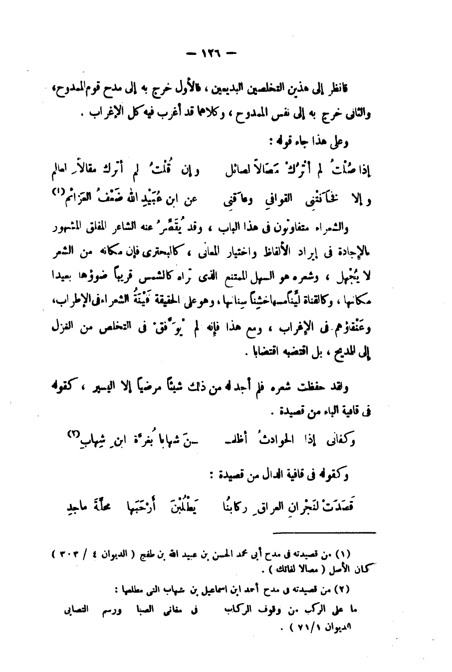 والشعراء متفاوتون في هذا الباب، وقد يقصر عنه الشاعر المفلق المشهور بالإجادة في إيراد الألفاظ واختيار المعاني، كالبحتري، فإن مكانه من الشعر لا يجهل، وشعره هو السهل الممتنع الذي تراه كالشمس قريبا ضوؤها بعيدا مكانها، وكالقناة لينا مسها خشنا سنانها، وهو على الحقيقة قينة الشعراء في الإطراب، وعنقاؤهم في الإغراب، ومع هذا فإنه لم يوفق في التخلص من الغزل إلى المديح بل اقتضبه اقتضابا.
