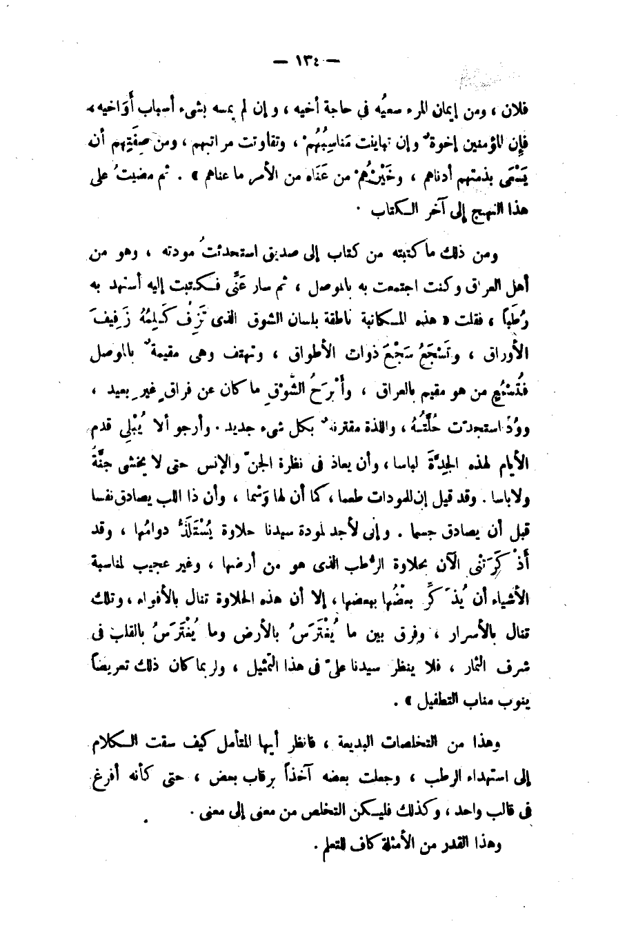 فلان ومن إيمان المرء سعيه في حاجة أخيه، وإن لم يمسه بشيء من أسباب أواخيه، فإن المؤمنين إخوة وإن تباينت مناسبهم، وتفاوتت مراتبهم، ومن صفتهم أن يسعى بذمتهم أدناهم، وخيرهم من عناه من الأمر ما عناهم"، ثم مضيت على هذا النهج إلى آخر الكتاب.
