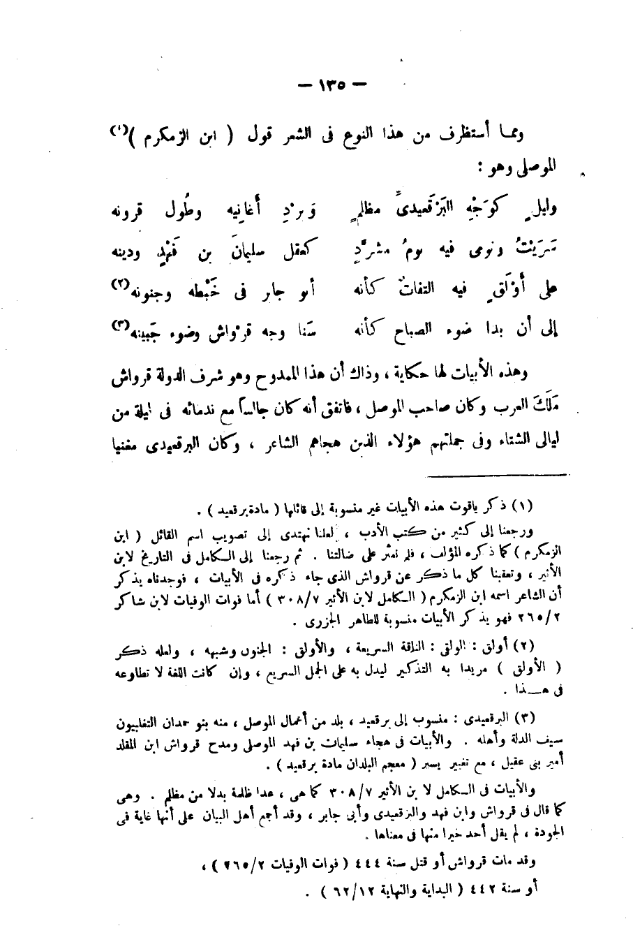 3 البرقعيدي: منسوب إلى برقعيد، بلد من أعمال الموصل، منه بنو حمدان التغلبيون سيف الدولة وأهله. والأبيات في هجاء سليمان بن فهد الموصلي ومدح قرواش ابن المقلد أمير بني عقيل، مع تغيير يسير "معجم البلدان مادة برقعيد".