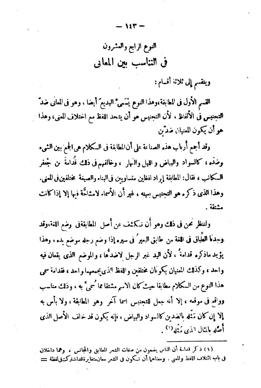 القسم الأول في المطابقة وهذا النوع يسمى البديع أيضا، وهو في المعاني ضد التجنيس في الألفاظ؛ لأن التجنيس هو أن يتحد اللفظ مع اختلاف المعنى، وهذا هو أن يكون المعنيان ضدين.