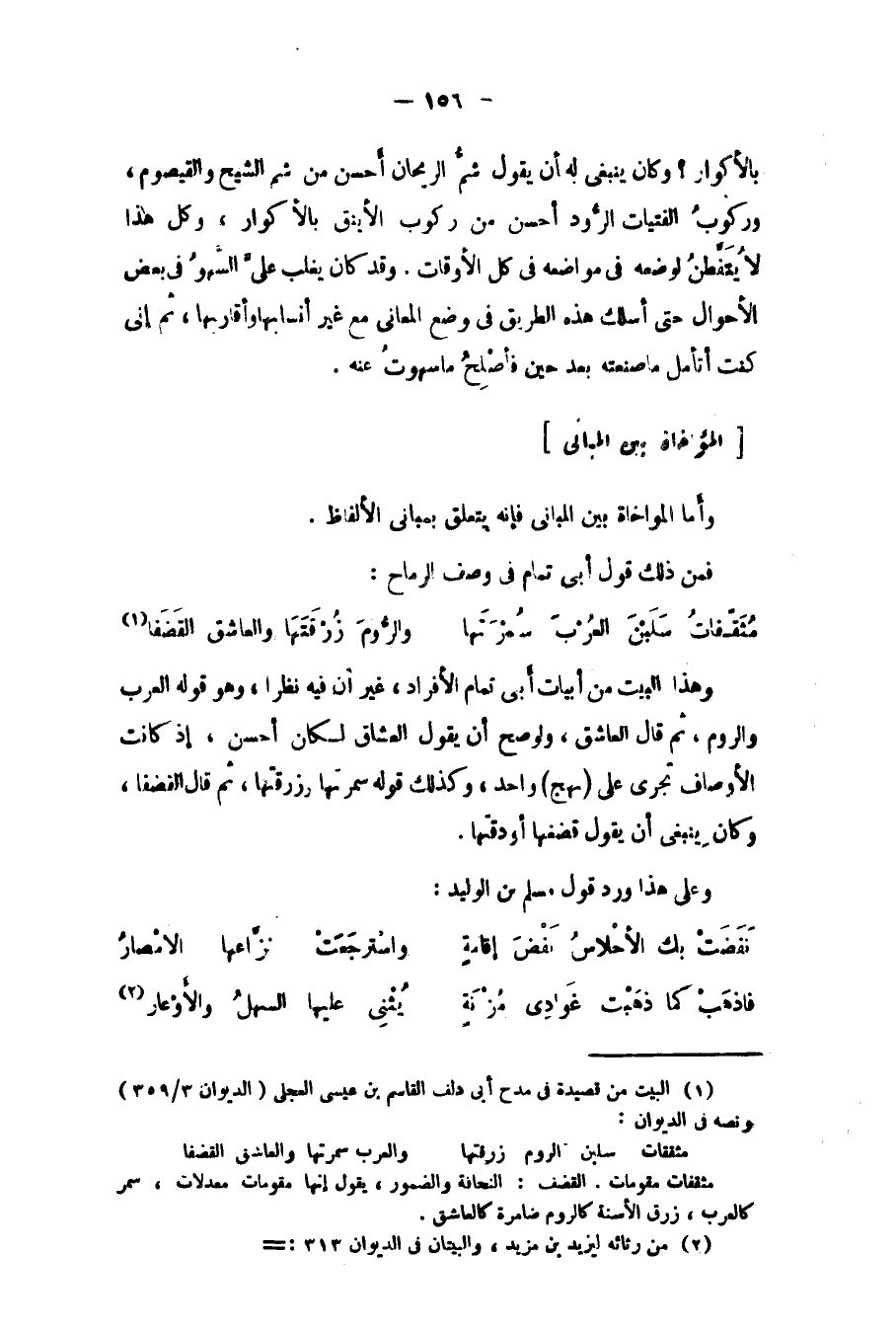 وهذا البيت من أبيات أبي تمام الأفراد، غير أن فيه نظرا، وهو قوله العرب والروم ثم قال العاشق، ولو صح أن يقول العشاق لكان أحسن، إذ كانت الأوصاف تجري على "نهج" واحد، وكذلك قوله سمرتها وزرقتها, ثم قال القضفا، وكان ينبغي أن يقول: قضفها أو دقتها.