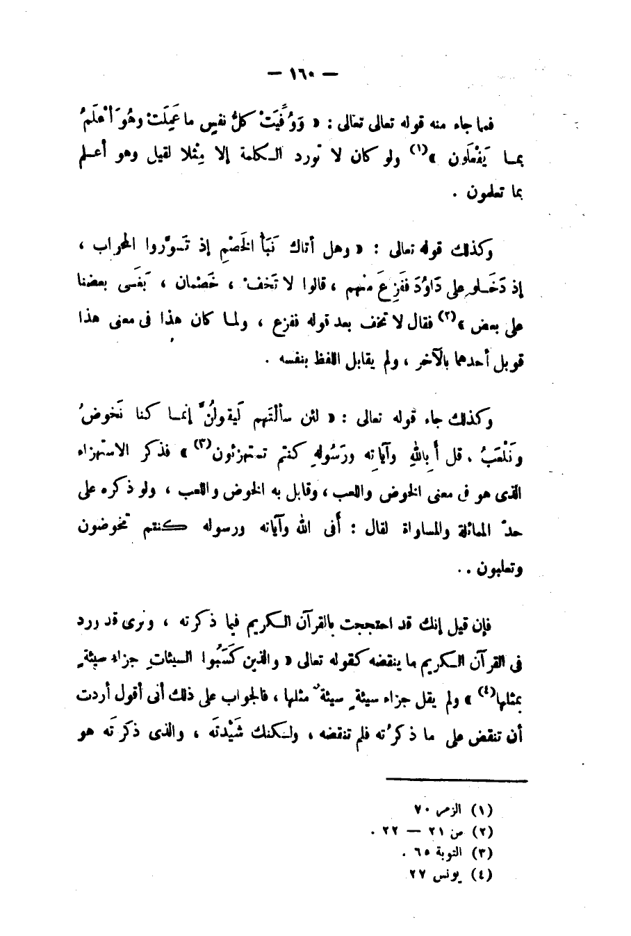 فإن قيل: إنك قد احتججت بالقرآن الكريم فيما ذكرته، ونرى قد ورد في القرآن الكريم ما ينقضه، كقوله تعالى: {وَالَّذِينَ كَسَبُوا السَّيِّئَاتِ جَزَاءُ سَيِّئَةٍ بِمِثْلِهَا} 4 ولم يقل جزاء سيئة سيئة مثلها, فالجواب على ذلك أني أقول: أردت أن تنقض على ما ذكرته فلم تنقضه، ولكنك شيدته، والذي ذكرته هو
