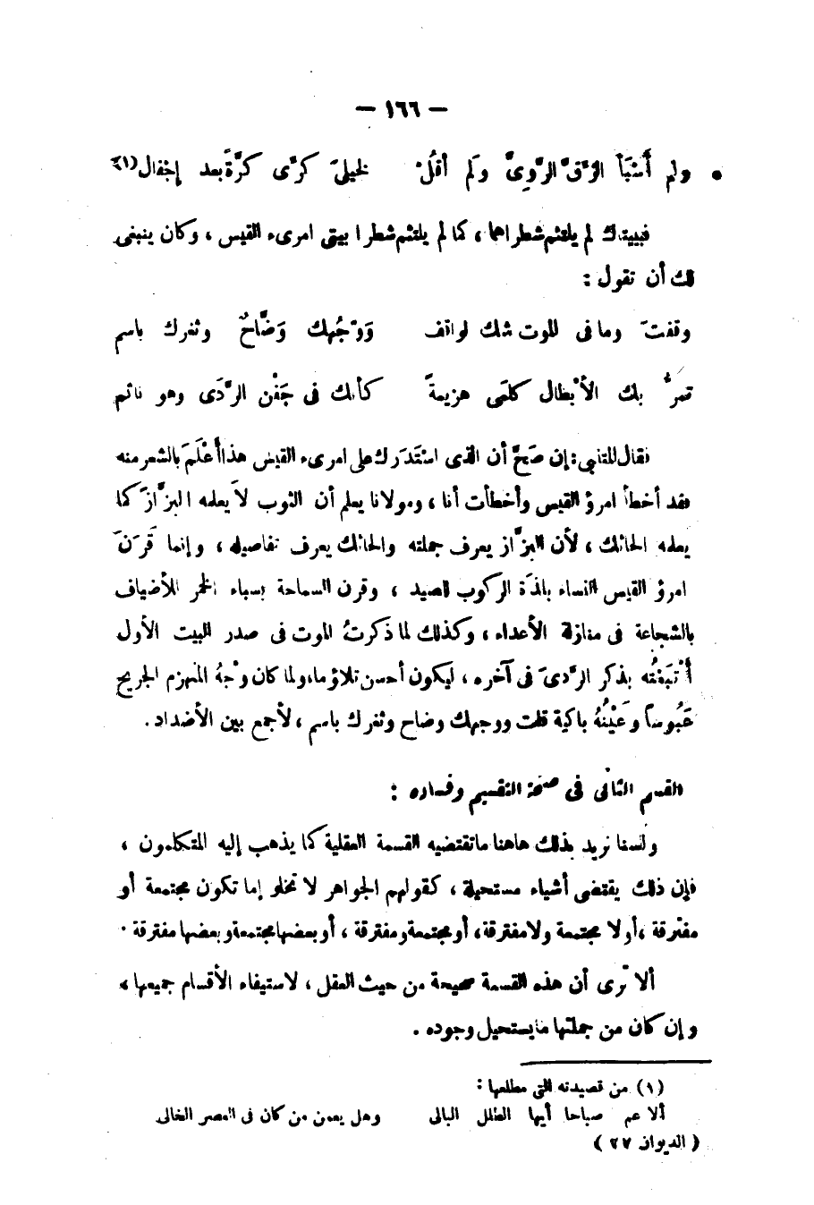 ولسنا نريد بذلك ههنا ما تقتضيه القسمة العقلية، كما يذهب إليه المتكلمون, فإن ذلك يقتضي أشياء مستحيلة كقولهم: الجواهر لا تخلو إما تكون مجتمعة أو مفترقة، أو لا مجتمعة ولا مفترقة، أو مجتمعة ومفترقة، أو بعضها مجتمعة وبعضها مفترقة.