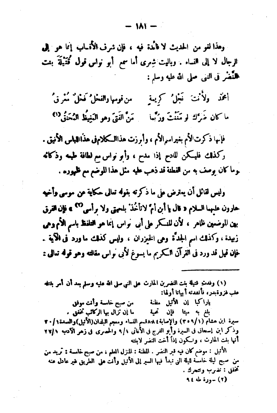 وهذا لغو من الحديث لا فائدة فيه، فإن شرف الأنساب إنما هو إلى الرجال، لا إلى النساء، ويا ليت شعري أما سمع أبو نواس قول قتيلة بنت النضر في النبي صلى الله عليه وسلم: