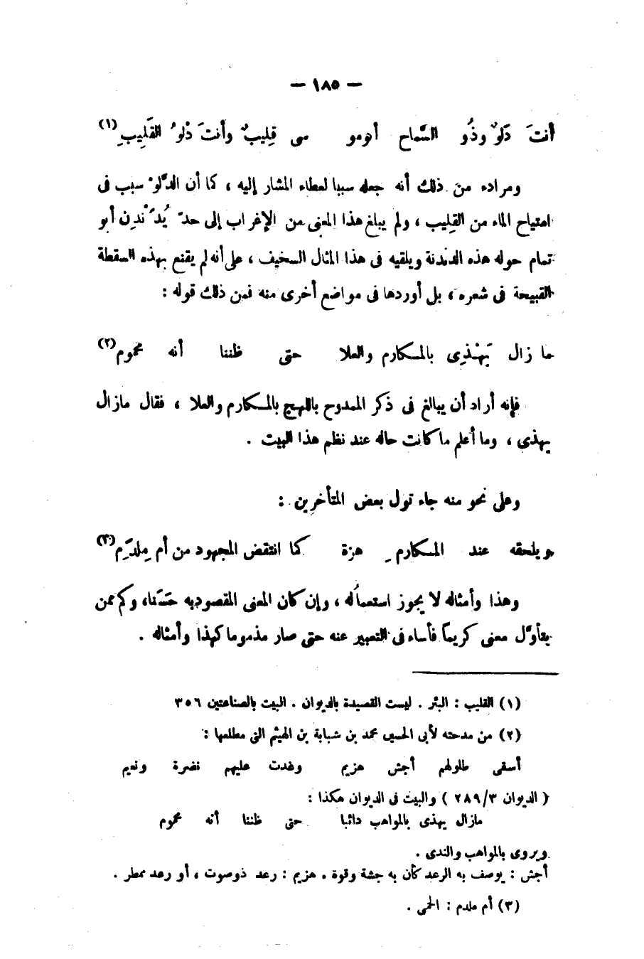ومراده من ذلك أنه جعله سببا لعطاء المشار إليه كما أن الدلو سبب في امتياح الماء من القليب، ولم يبلغ هذا المعنى من الإغراب إلى حد يدندن أبو تمام حوله هذه الدندنة، ويلقيه في هذا المثال السخيف، على أنه لم يقنع بهذه السقطة القبيحة في شعره، بل أوردها في مواضع أخرى منه، فمن ذلك قوله: