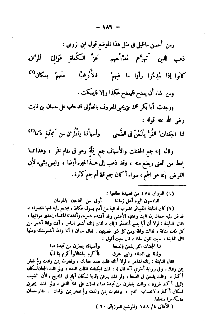 فقال النابغة: إنك لشاعر، لولا أنك قللت عدد جفانك، وفخرت بمن ولدت ولم تفخر بمن ولدك، وفي رواية أخرى أنه قال له: قلت الجفنات فقللت العدد، ولو قلت الجفان لكان أكثر، وقلت يلمعن في الضحا، ولو قلت يبرقن بالدجا لكان أبلغ في المديح؛ لأن الضيف بالليل أكثر طروقا، وقلت يقطرن من نجدة دما، فدللت على قلة القتلى، ولو قلت يجرين لكان أكثر، لانصباب الدم، وفخرت بمن ولدت ولم تفخر بمن ولدك، فقام حسان منكسرا منقطعا.