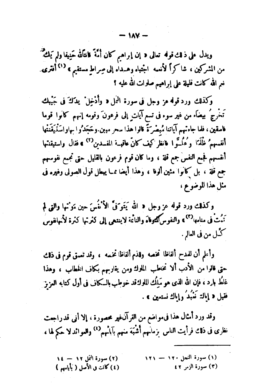 ويدل على ذلك قوله تعالى: {إِنَّ إِبْرَاهِيمَ كَانَ أُمَّةً قَانِتًا لِلَّهِ حَنِيفًا وَلَمْ يَكُ مِنَ الْمُشْرِكِينَ، شَاكِرًا لِأَنْعُمِهِ اجْتَبَاهُ وَهَدَاهُ إِلَى صِرَاطٍ مُسْتَقِيمٍ} 1 أفترى نعم الله أكانت قليلة على إبراهيم صلوات الله عليه؟