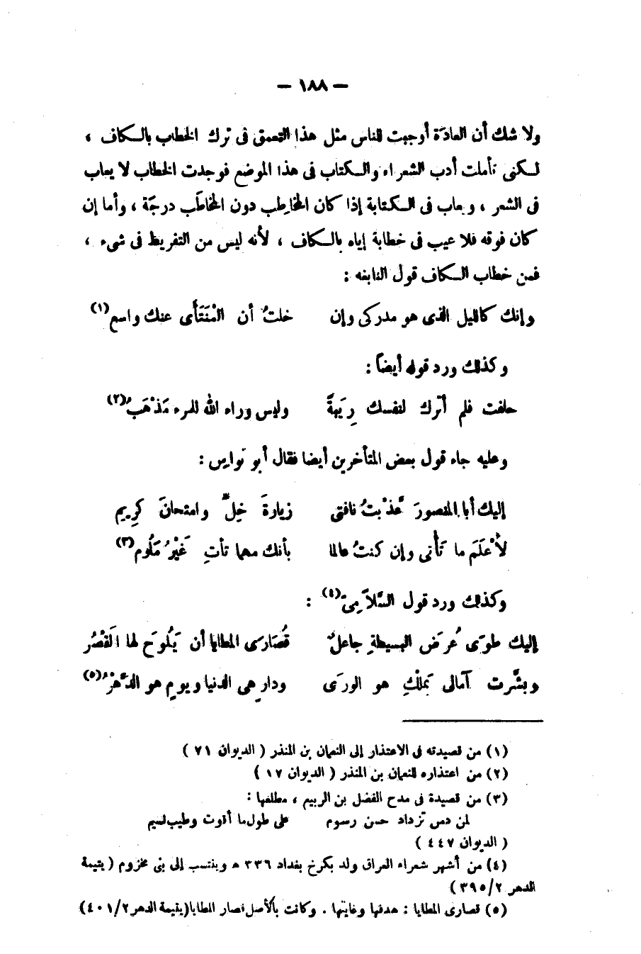 ولا شك أن العادة أوجبت للناس مثل هذا التعمق في ترك الخطاب بالكاف، لكني تأملت أدب الشعراء والكتاب في هذا الموضع فوجدت الخطاب لا يعاب في الشعر ويعاب في الكتابة إذا كان المخاطب دون المخاطب درجة، وأما إن كان فوقه فلا عيب في خطابه إياه بالكاف؛ لأنه ليس من التفريط في شيء, فمن خطاب الكاف قول النابغة: