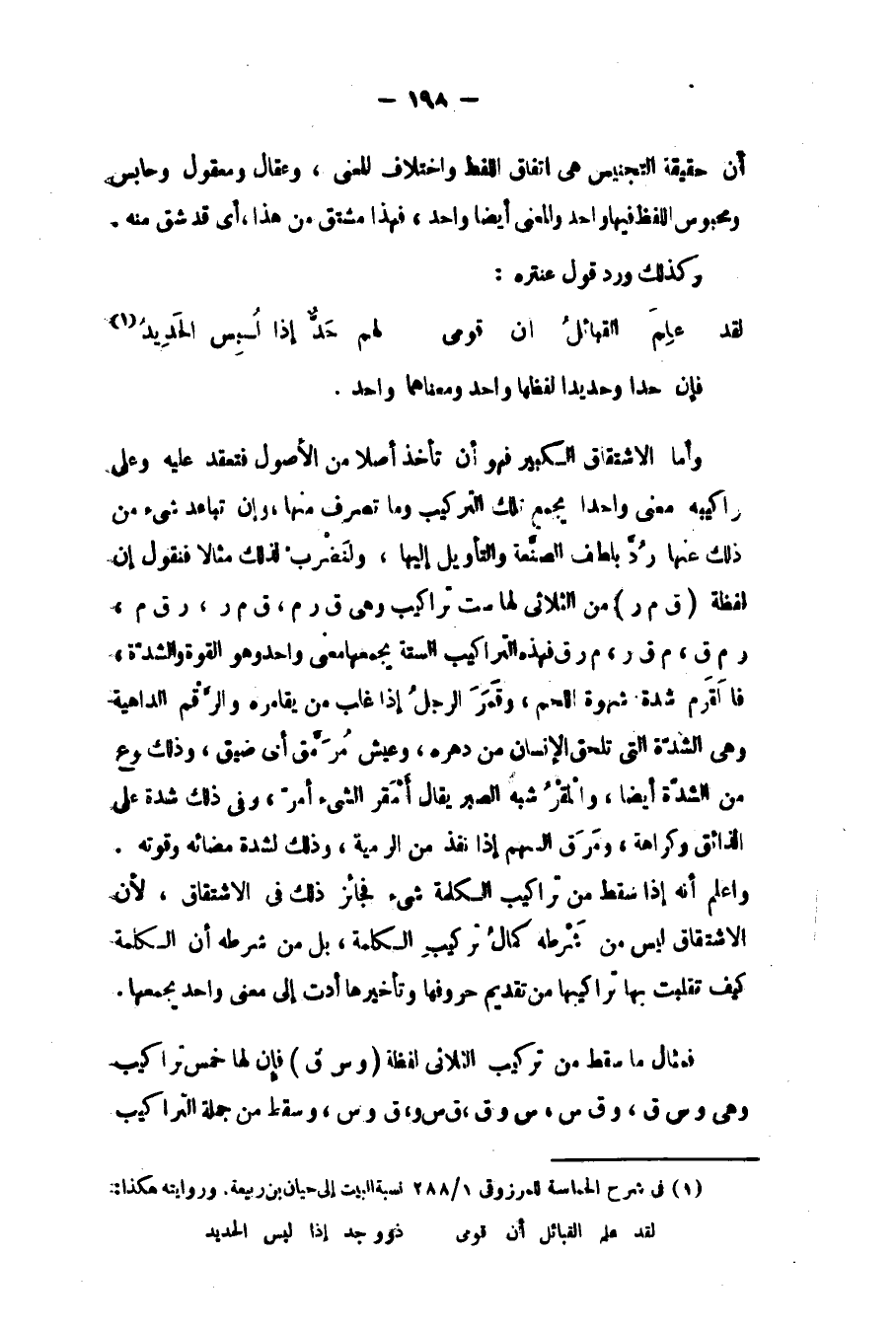 وأما الاشتقاق الكبير فهو أن تأخذ أصلا من الأصول فتعقد عليه وعلى تراكيبه معنى واحدا يجمع تلك التراكيب, وما تصرف منها, وإن تباعد شيء من ذلك عنها رد بلطف الصنعة والتأويل إليها. ولنضرب لذلك مثالا، فنقول: إن لفظة "ق م ر" من الثلاثي لها ست تراكيب، وهي: "ق ر م، ق م ر، ر ق م، ر م ق، م ق ر، م ر ق"، فهذه التراكيب الست يجمعها معنى واحد، وهو القوة والشدة، فالقرم: شدة شهوة اللحم، وقمر الرجل، إذا غلب من يقامره، والرقم: الداهية، وهي الشدة التي تلحق الإنسان من دهره، وعيش مرمق أي: ضيق، وذلك نوع من الشدة أيضا، والمقر: شبه الصبر، يقال: أمقر الشيء، إذا أمر، وفي ذلك شدة على الذائق وكراهة، ومرق السهم، إذا نفذ من الرمية، وذلك لشدة مضائه وقوته. واعلم أنه إذا سقط من تراكيب الكلمة شيء فجائز ذلك في الاشتقاق؛ لأن الاشتقاق ليس من شرطه كمال تركيب الكلمة، بل من شرطه أن الكلمة كيف تقلبت بها تراكيبها من تقديم حروفها وتأخيرها أدت إلى معنى واحد يجمعها.