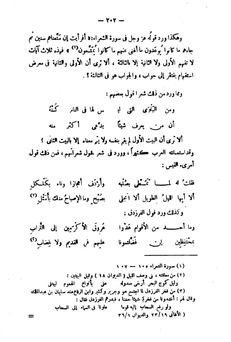 وهكذا ورد قوله عز وجل في سورة الشعراء: {أَفَرَأَيْتَ إِنْ مَتَّعْنَاهُمْ سِنِينَ، ثُمَّ جَاءَهُمْ مَا كَانُوا يُوعَدُونَ، مَا أَغْنَى عَنْهُمْ مَا كَانُوا يُمَتَّعُونَ} 1 فهذه ثلاث آيات لا تفهم الأولى ولا الثانية إلا بالثالثة، ألا ترى أن الأولى والثانية في معرض استفهام يفتقر إلى جواب، والجواب هو في الثالثة؟.