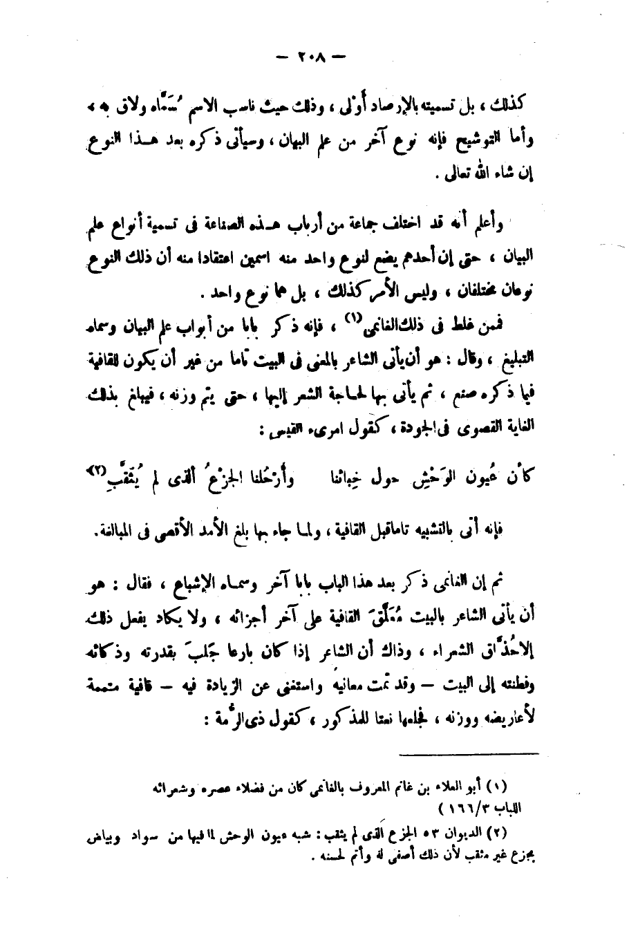 ثم إن الغانمي ذكر بعد هذا الباب بابا آخر، وسماه الإشباع، فقال: هو أن يأتي الشاعر بالبيت معلق القافية على آخر أجزائه، ولا يكاد يفعل ذلك إلا حذاق الشعراء، وذاك أن الشاعر إذا كان بارعا جلب بقدرته وذكائه وفطنته إلى البيت -وقد تمت معانيه واستغنى عن الزيادة فيه- قافية متممة لأعاريضه ووزنه فجعلها نعتا للمذكور، كقول ذي الرمة:
