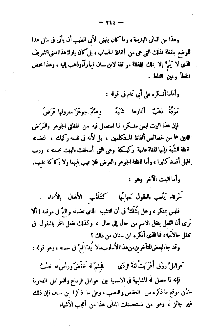 فإنه لما حصل له المشابهة في الاسمية بين عوامل الرماح والعوامل النحوية حسن موقع ما ذكره من الخفض والنصب، وعلى ما ذكره ابن سنان فإن ذلك غير جائز، وهو من مستحسنات المعاني، هذا من أعجب الأشياء.