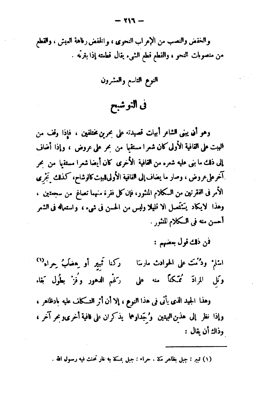 وهو أن يبني الشاعر أبيات قصيدته على بحرين مختلفين، فإذا وقف من البيت على القافية الأولى كان شعرا مستقيما من بحر على عروض، وإذا أضاف إلى ذلك ما بنى عليه شعره من القافية الأخرى كان أيضًا شعرا مستقيما من بحر آخر على عروض، وصار ما يضاف إلى القافية الأولى للبيت كالوشاح، وكذلك يجري الأمر في الفقرتين من الكلام المنثور، فإن كان فقرة منهما تصاغ من سجعتين, وهذا لا يكاد يستعمل إلا قليلا وليس من الحسن في شيء، واستعماله في الشعر أحسن منه في الكلام المنثور،