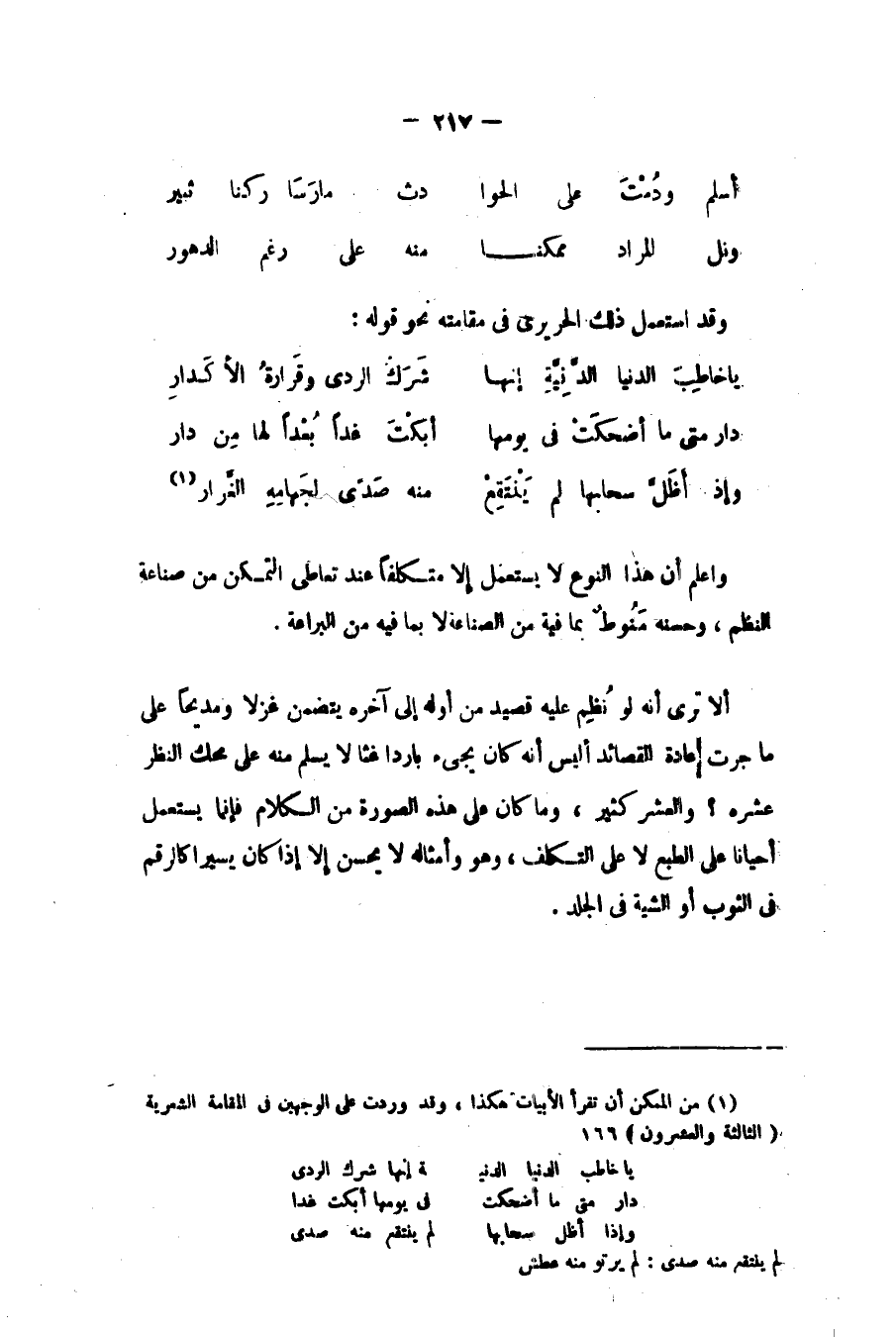 1 من الممكن أن تقرأ الأبيات هكذا، وقد وردت على الوجهين في المقامة الشعرية "الثالثة والعشرون" 166.