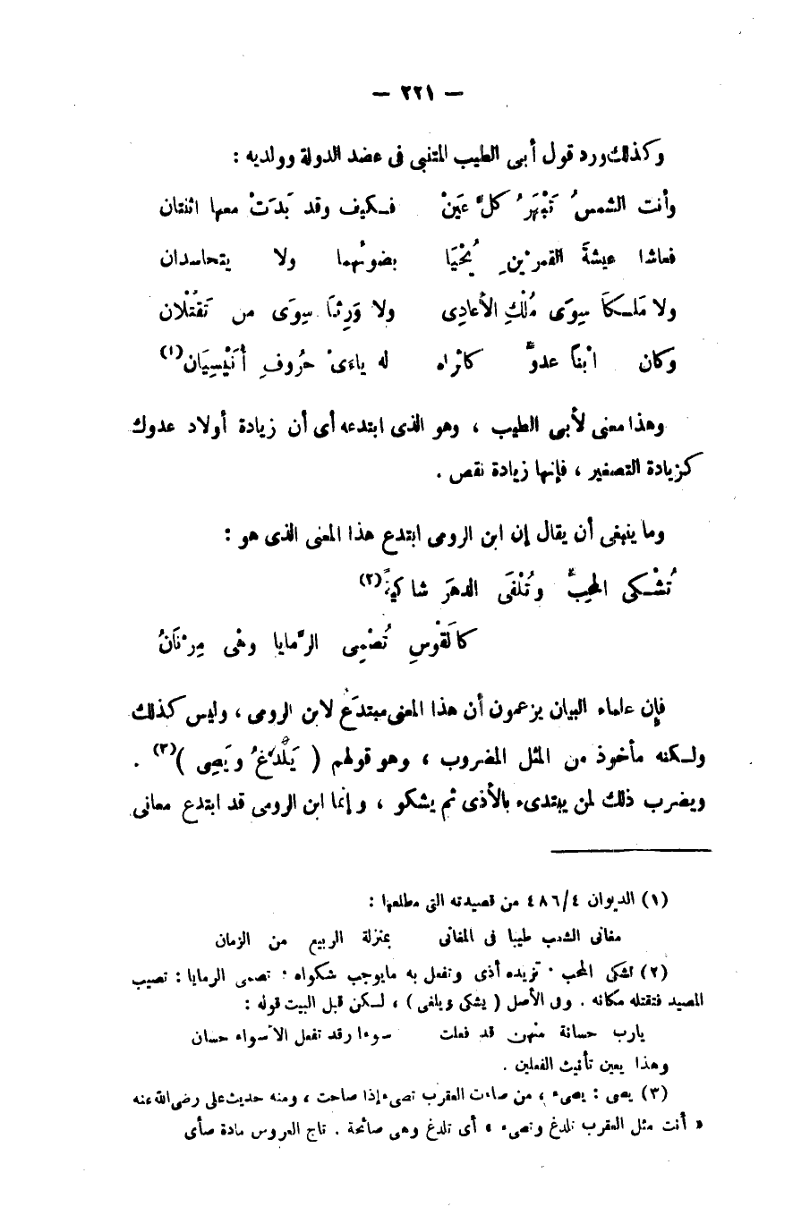 فإن علماء البيان يزعمون أن هذا المعنى مبتدع لابن الرومي، وليس كذلك، ولكنه مأخوذ من المثل المضروب، وهو قولهم: "يلدغ ويصي"3، ويضرب ذلك لمن يبتدئ بالأذى ثم يشكو، وإنما ابن الرومي قد ابتدع معاني