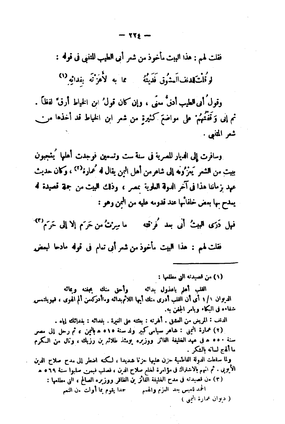 2 عمارة اليمني: شاعر سياسي كبير ولد سنة 515هـ باليمن، ثم رحل إلى مصر سنة 550هـ في عهد الخليفة الفائز ووزيره يومئذ طلائع بن رزيك، ونال من الكرم ما ألهج لسانه بالشكر.
