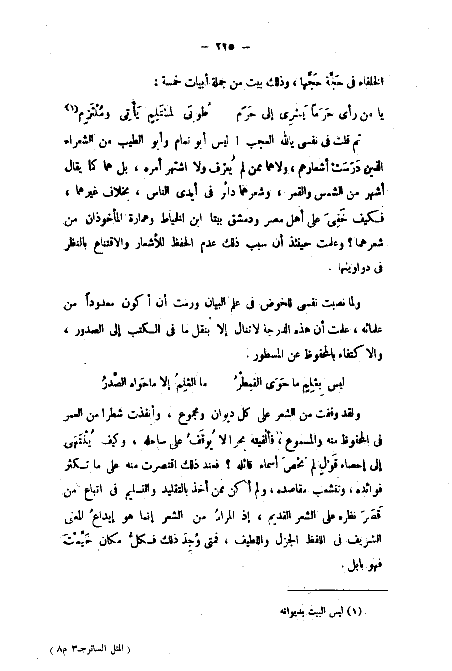 ثم قلت في نفسي: يالله العجب! ليس أبو تمام وأبو الطيب من الشعراء الذين درست أشعارهم، ولا هما ممن لم يعرف ولا اشتهر أمره، بل هما كما يقال: أشهر من الشمس والقمر، وشعرهما دائر في أيدي الناس، بخلاف غيرهما، فكيف خفي على أهل مصر ودمشق بيتا ابن الخياط وعمارة المأخوذان من شعرهما? وعلمت حينئذ أن سبب ذلك عدم الحفظ للأشعار، والاقتناع بالنظر في دواوينها.