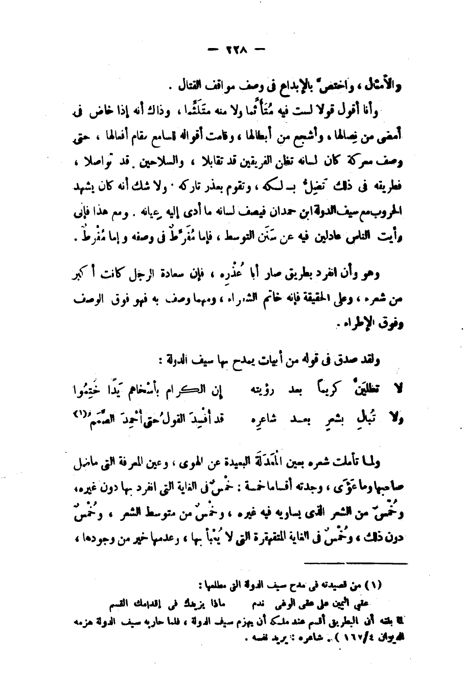 وأنا أقول قولا لست فيه متأثما، ولا منه متلثما، وذاك أنه إذا خاض في وصف معركة كان لسانه أمضى من نصالها، وأشجع من أبطالها، وقامت أقواله للسامع مقام أفعالها، حتى تظن الفريقين قد تقابلا، والسلاحين قد تواصلا، فطريقه في ذلك تضل بسالكه، وتقوم بعذر تاركه، ولا شك أنه كان يشهد الحروب مع سيف الدولة ابن حمدان فيصف لسانه، ما أدى إليه عيانه، ومع هذا فإني رأيت الناس عادلين فيه عن سنن التوسط، فإما مفرط في وصفه وإما مفرط.