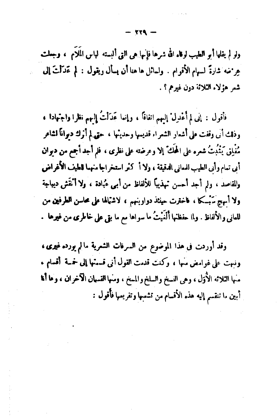 ولو لم يقلها أبو الطيب لوقاه الله شرها، فإنها التي ألبسته لباس الملام وجعلت عرضه شارة لسهام الأقوام. ولسائل ههنا أن يسأل ويقول: لما عدلت إلى شعر هؤلاء الثلاثة دون غيرهم?