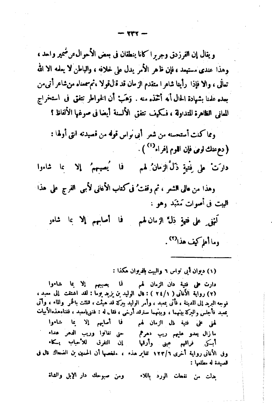 ويقال إن الفرزدق وجريرا كانا ينطقان في بعض الأحوال عن ضمير واحد, وهذا عندي مستبعد، فإن ظاهر الأمر يدل على خلافه، والباطن لا يعلمه إلا الله تعالى, وإلا فإذا رأينا شاعرا متقدم الزمان قد قال قولا ثم سمعناه من شاعر أتى من بعده علمنا بشهادة الحال أنه أخذه منه، وهب أن الخواطر تتفق في استخراج المعاني الظاهرة المتداولة، فكيف تتفق الألسنة في صوغها الألفاظ?