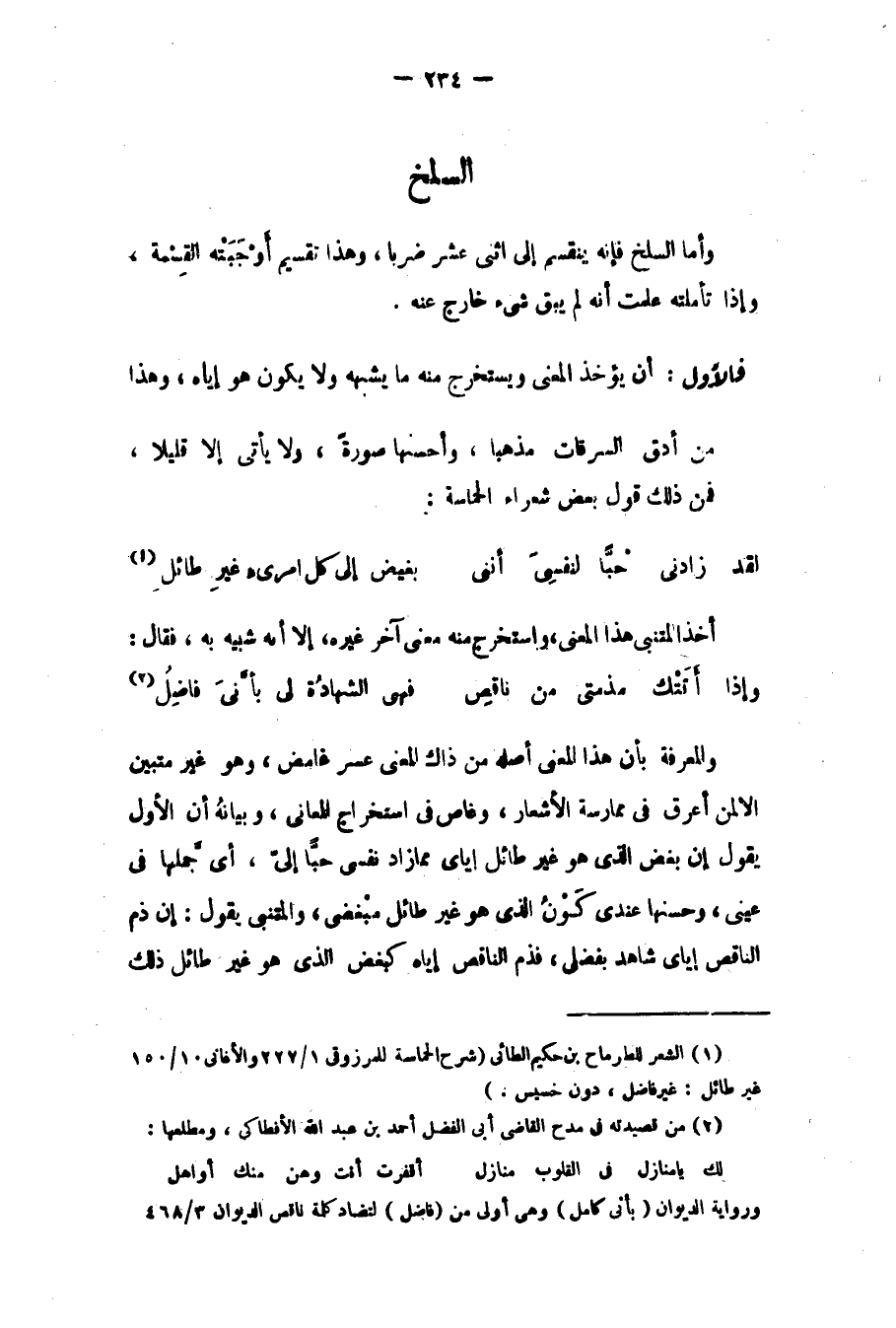 فالأول: أن يؤخذ المعنى ويستخرج منه ما يشبهه، ولا يكون هو إياه، وهذا من أدق السرقات مذهبا، وأحسنها صورة ولا يأتي إلا قليلا. فمن ذلك قول بعض شعراء الحماسة: