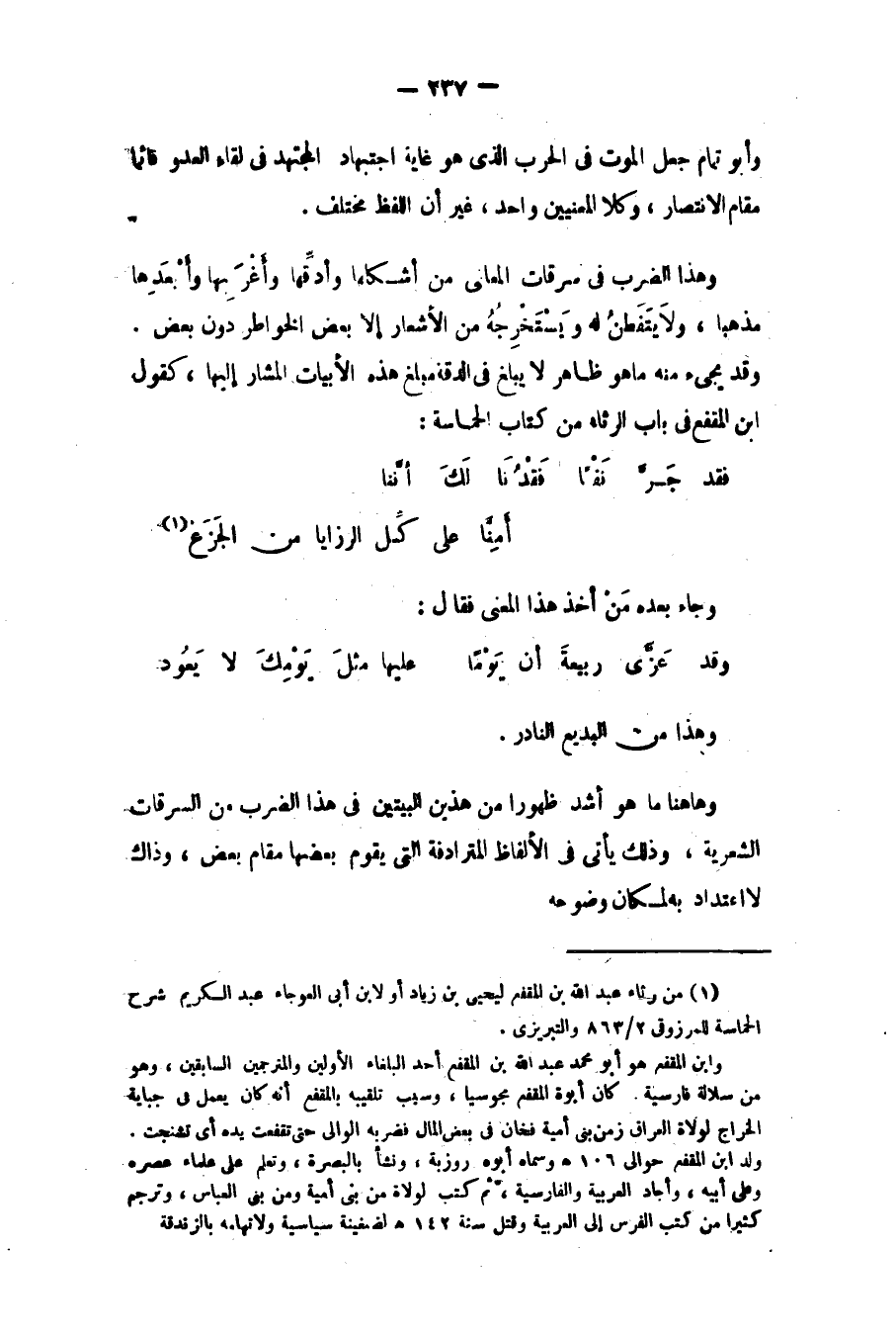 وهذا الضرب في سرقات المعاني من أشكلها، وأدقها وأغربها، وأبعدها مذهبا، ولا يتفطن له ويستخرجه من الأشعار إلا بعض الخواطر دون بعض. وقد يجيء منه ما هو ظاهر لا يبلغ في الدقة مبلغ هذه الأبيات المشار إليها، كقول ابن المقفع في باب الرثاء من كتاب الحماسة: