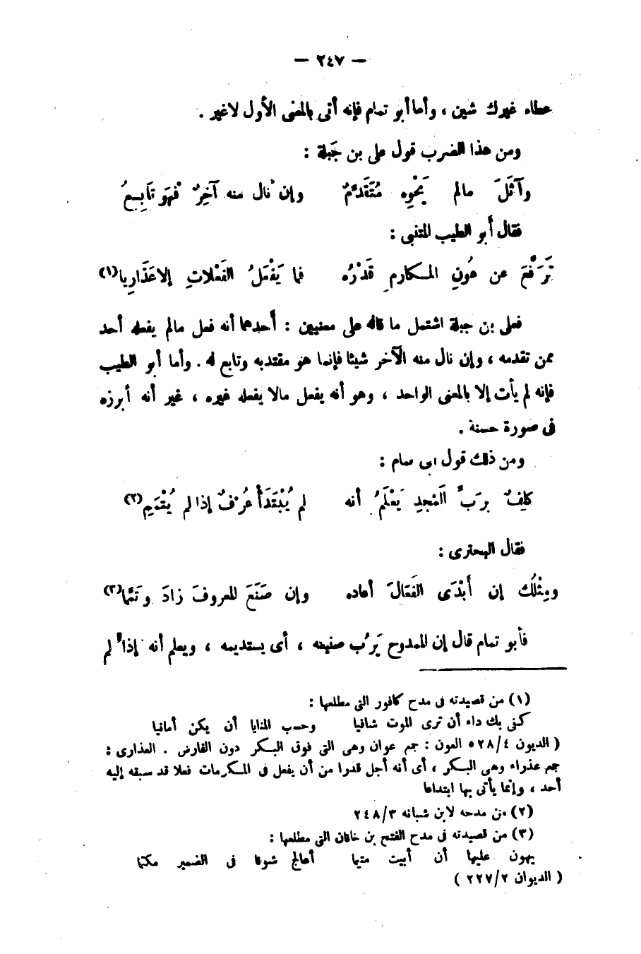 فعلي بن جبلة اشتمل ما قاله على معنيين: أحدهما أنه فعل ما لم يفعله أحد ممن تقدمه، وإن نال منه الآخر شيئا فإنما هو مقتد به، وتابع له، وأما أبو الطيب المتنبي فإنه لم يأت إلا بالمعنى الواحد، وهو أنه يفعل ما لا يفعله غيره، غير أنه أبرزه في صورة حسنة.