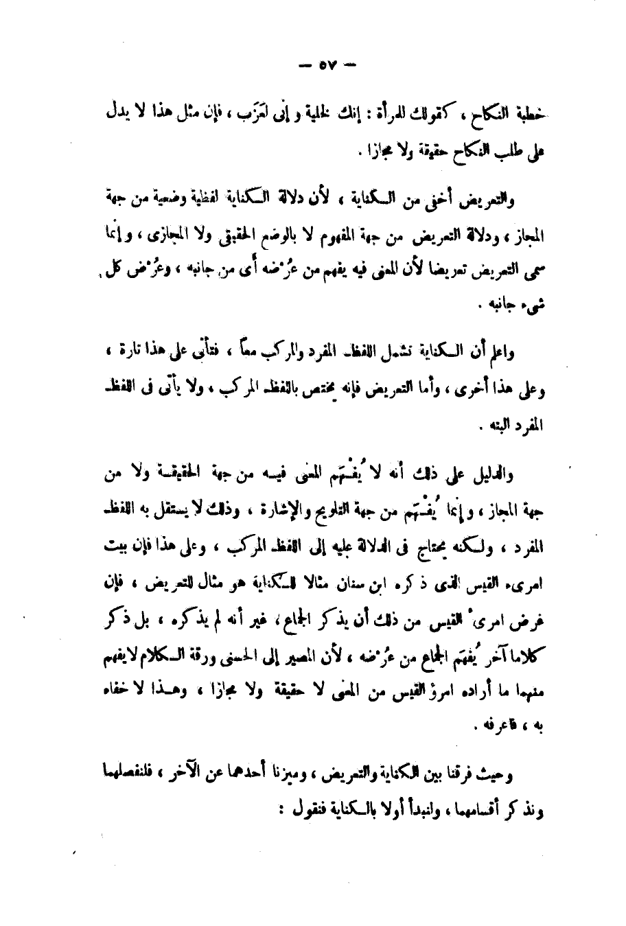 وحيث فرقنا بين الكناية والتعريض وميزنا أحدهما عن الآخر فلنفصلهما ونذكر أقسامهما، ولنبدأ أولًا بالكناية فنقول: