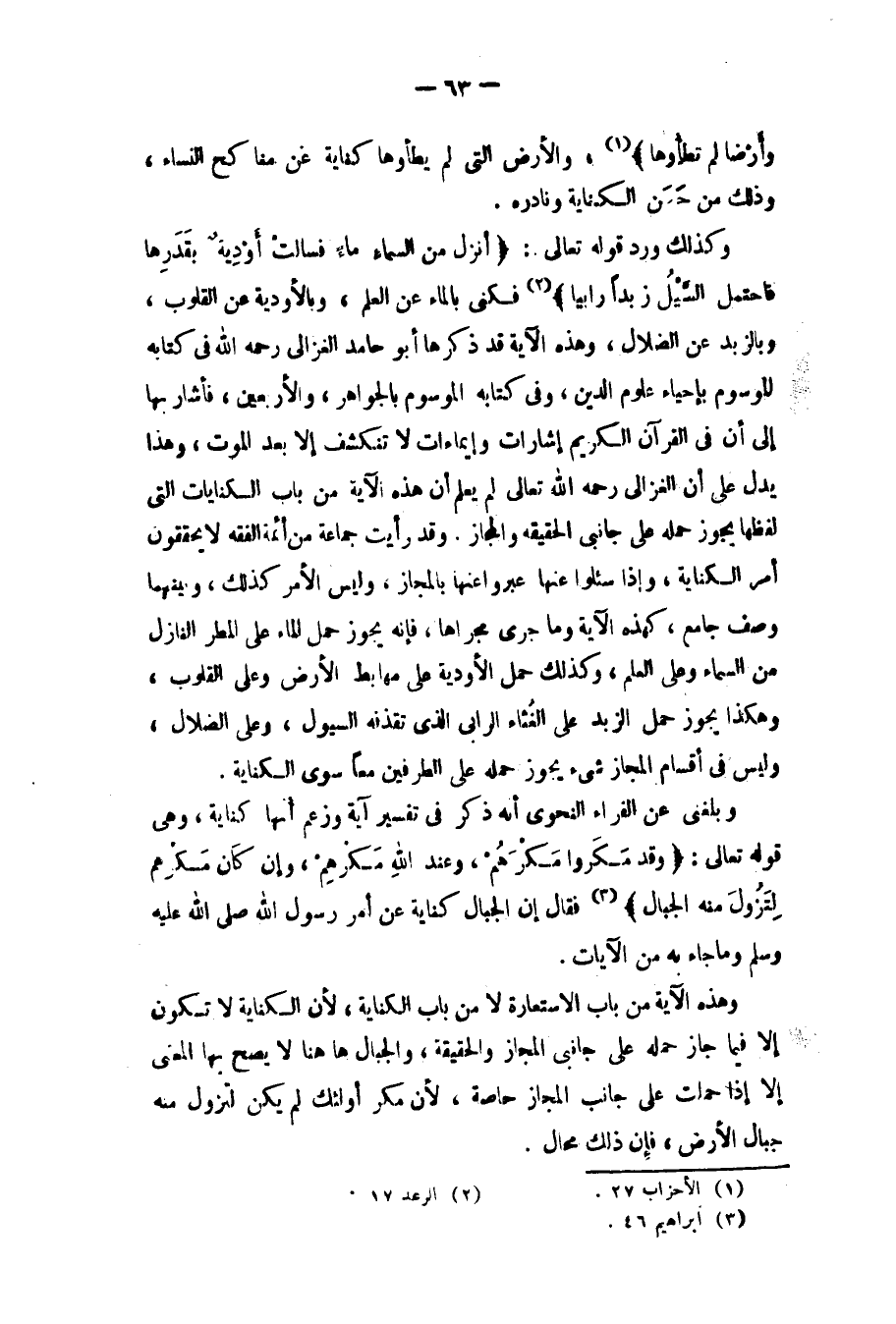 وكذلك ورد قوله تعالى: {أَنْزَلَ مِنَ السَّمَاءِ مَاءً فَسَالَتْ أَوْدِيَةٌ بِقَدَرِهَا فَاحْتَمَلَ السَّيْلُ زَبَدًا رَابِيًا} 2 فكنى بالماء عن العلم, وبالأودية عن القلوب وبالزبد عن الضلال، وهذه الآية قد ذكرها أبو حامد الغزالي رحمه الله في كتابه الموسوم بإحياء علوم الدين, وفي كتابه الموسوم بالجواهر, والأربعين, فأشار بها إلى أن في القرآن الكريم إشارات وإيماءات لا تنكشف إلا بعد الموت، وهذا يدل على أن الغزالي رحمه الله لم يعلم أن هذه الآية من باب الكنايات التي لفظها يجوز حمله على جانبي الحقيقة والمجاز, وقد رأيت جماعة من أئمة الفقه لا يحققون أمر الكناية، وإذا سئلوا عنها عبروا عنها بالمجاز, وليس الأمر كذلك، وبينهما وصف جامع, كهذه الآية وما جرى مجراها، فإنه يجوز حمل الماء على المطر النازل من السماء، وعلى العلم، وكذلك يجوز حمل الأودية على مهابط الأرض وعلى القلوب، وهكذا يجوز حمل الزبد على الغثاء الرابي الذي تقذفه السيول، وعلى الضلال، وليس في أقسام المجاز شيء يجوز حمله على الطرفين معا سوى الكناية.