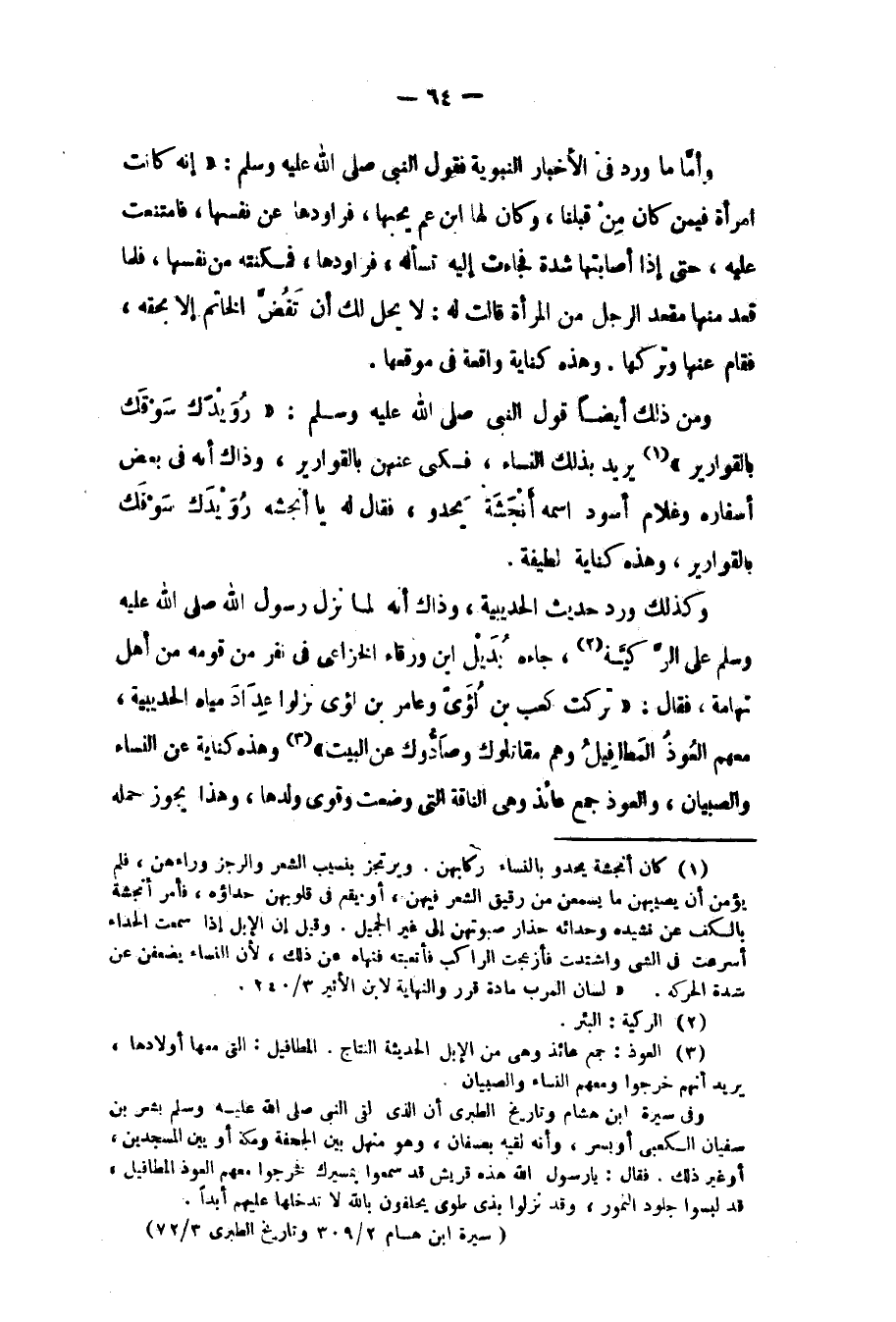 ومن ذلك أيضًا قول النبي صلى الله عليه وسلم: "رويدك سوقك بالقوارير" 1, يريد بذلك النساء، فكنى عنهن بالقوارير، وذاك أنه كان في بعض أسفاره وغلام أسود اسمه أنجشة يحدو، فقال له: "يا أنجشة رويدك بالقوارير" وهذه كناية لطيفة.
