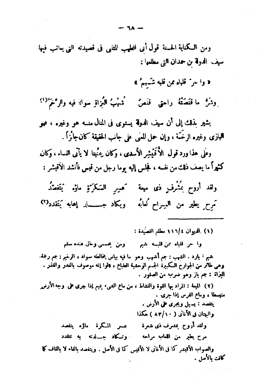 ومن الكناية الحسنة قول أبي الطيب المتنبي في قصيدته التي يعاتب فيها سيف الدولة بن حمدان التي مطلعها: