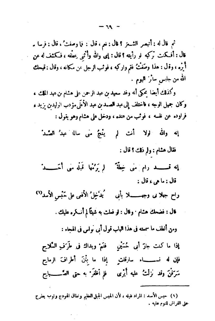 ثم قال له: أتبصر الشعر? قال: نعم، قال: فما وصفت? قال: فرسا، قال: أفكنت تركبه لو رأيته? قال: إي والله وأثني عطفه، فكشف له عن أيره، وقال: هذا وصفت، فقم فاركبه، فوثب الرجل من مكانه، وقال: قبحك الله من جليس سائر اليوم.