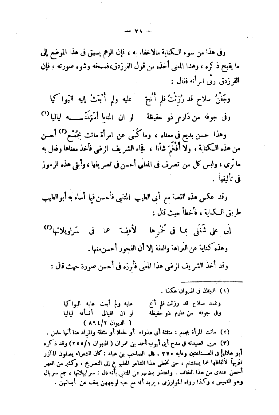 3 من قصيدته في مدح أبي أيوب أحمد بن عمران "الديوان 1/ 255" وقد ذكره أبو هلال في الصناعتين وعابه 375. قال الصاحب بن عباد: كان الشعراء يصفون المآزر تنزيها لألفاظها عما يستشنع، حتى تخطى هذا الشاعر المطبوع إلى التصريح، وكثير من العهر أحسن عندي من هذا العفاف. واعتذر بعضهم عن المتنبي بأنه قال: سرابيلاتها، جمع سربال وهو القميص، وكذا رواه الخوارزمي، يريد أنه مع حبه لوجههن يعف عن أبدانهن.
