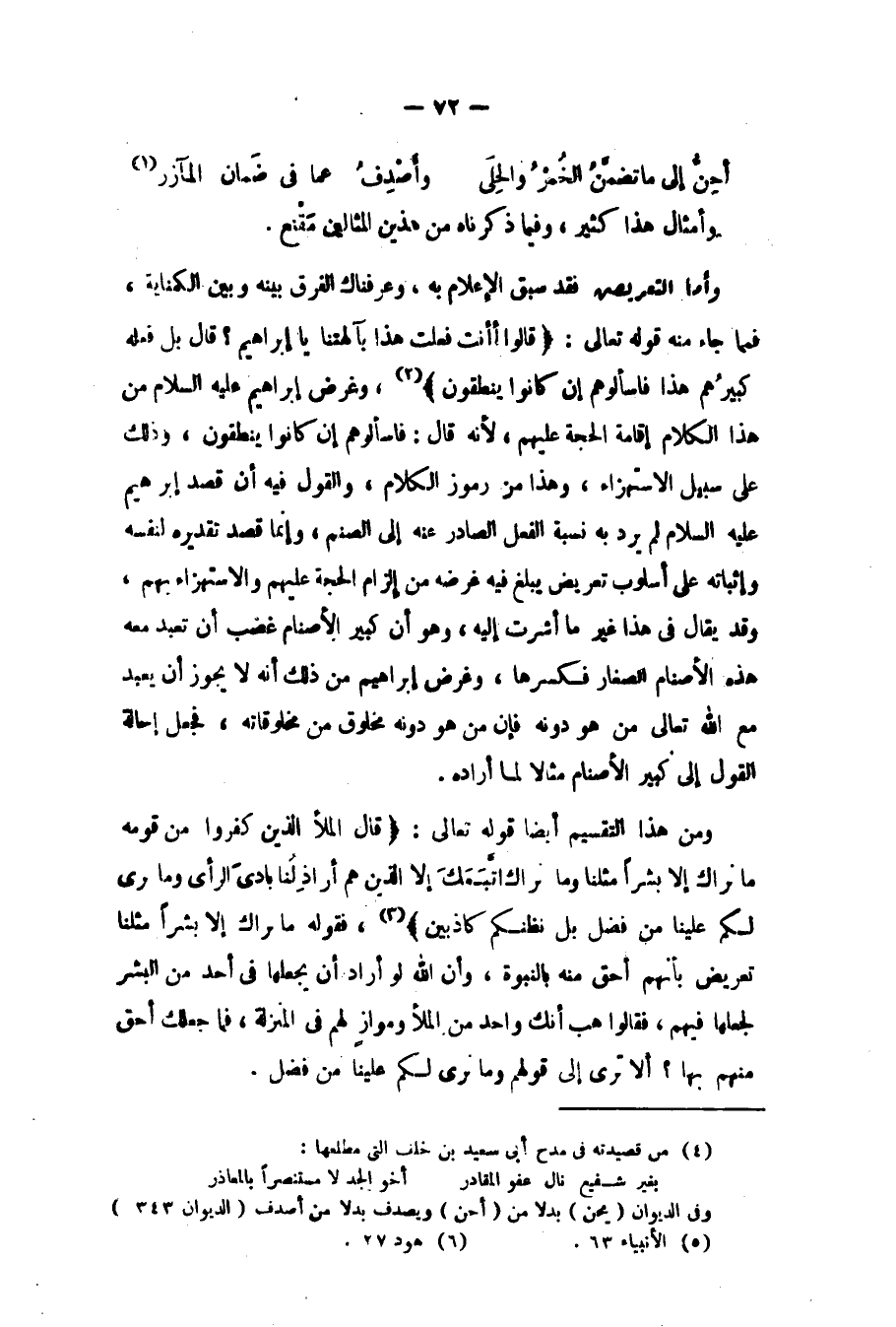 وأما التعريض فقد سبق الإعلام به، وعرفناك الفرق بينه وبين الكناية, فما جاء منه قوله تعالى: {قَالُوا أَأَنْتَ فَعَلْتَ هَذَا بِآلِهَتِنَا يَا إِبْرَاهِيمُ، قَالَ بَلْ فَعَلَهُ كَبِيرُهُمْ هَذَا فَاسْأَلُوهُمْ إِنْ كَانُوا يَنْطِقُونَ} 2, وغرض إبراهيم عليه السلام من هذا الكلام إقامة الحجة عليهم؛ لأنه قال: {فَاسْأَلُوهُمْ إِنْ كَانُوا يَنْطِقُونَ} وذلك على سبيل الاستهزاء، وهذا من رموز الكلام، والقول فيه أن قصد إبراهيم عليه السلام لم يرد به نسبة الفعل الصادر عنه إلى الصنم، وإنما قصد تقديره لنفسه وإثباته على أسلوب تعريض يبلغ فيه غرضه من إلزام الحجة عليهم والاستهزاء بهم، وقد يقال في هذا غير ما أشرت إليه، وهو أن كبير الأصنام غضب أن تعبد معه هذه الأصنام الصغار فكسرها، وغرض إبراهيم عليه السلام من ذلك أنه لا يجوز أن يعبد مع الله تعالى من هو دونه، فإن من هو دونه مخلوق من مخلوقاته، فجعل إحالة القول إلى كبير الأصنام مثالا لما أراده.