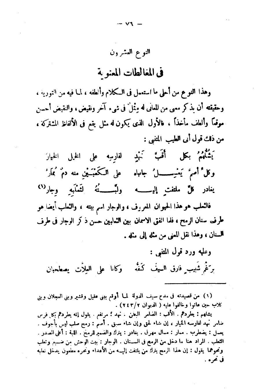 وهذا النوع من أحلى ما استعمل في الكلام وألطفه، لما فيه من التورية, وحقيقته أن يذكر معنى من المعاني له مثل في شيء آخر ونقيض، والنقيض أحسن موقعا، وألطف مأخذا. فالأول الذي يكون له مثل يقع في الألفاظ المشتركة، فمن ذلك قول أبي الطيب المتنبي: