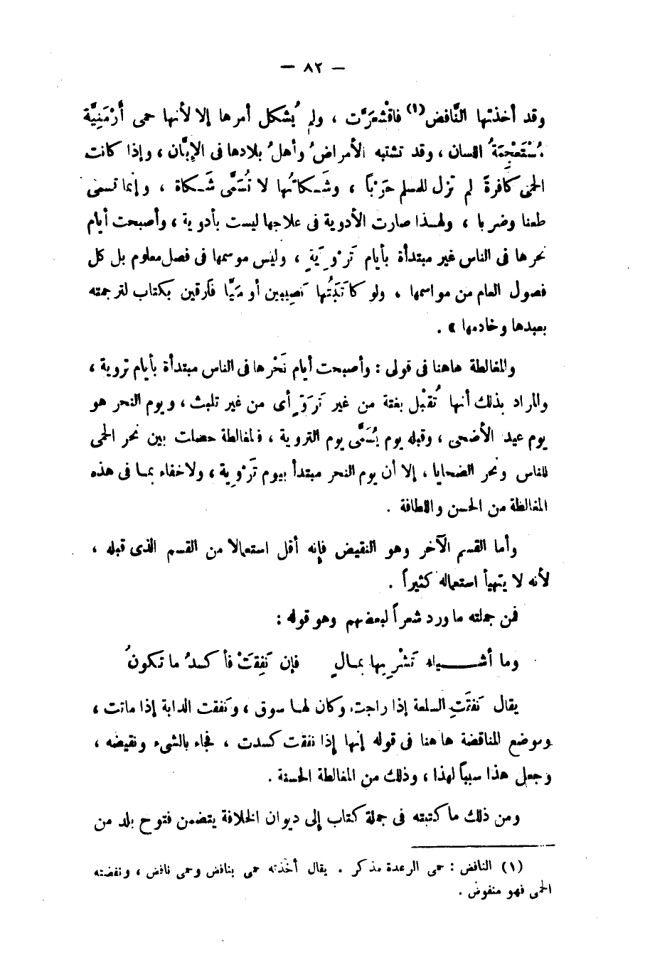 والمغالطة ههنا في قولي: وأصبحت أيام نحرها في الناس غير مبتدأة بأيام تروية. والمراد بذلك أنها تقبل بغتة من غير ترو أي: من غير تلبث، ويوم النحرهو يوم عيد الأضحى، وقبله يوم يسمى يوم التروية، فالمغالطة حصلت بين نحر الحمى للناس ونحر الضحايا، إلا أن يوم النحر مبتدأ بيوم التروية، ولا خفاء بما في هذه المغالطة من الحسن واللطافة.