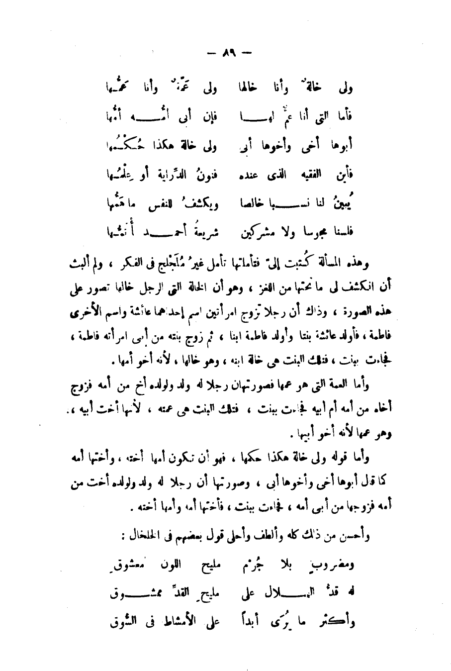 وهذه المسألة كتبت إلي فتأملتها تأمل غير ملجلج في الفكر، ولم ألبث أن انكشف لي ما تحتها من اللغز، وهو أن الخالة التي الرجل خالها تصور على هذه الصورة، وذاك أن رجلا تزوج امرأتين: اسم إحداهما عائشة، واسم الأخرى فاطمة، فأولد عائشة بنتا، وأولد فاطمة ابنا، ثم زوج بنته من أبي امرأته فاطمة، فجاءت ببنت، فتلك البنت هي خالة ابنه، وهو خالها؛ لأنه أخو أمها.
