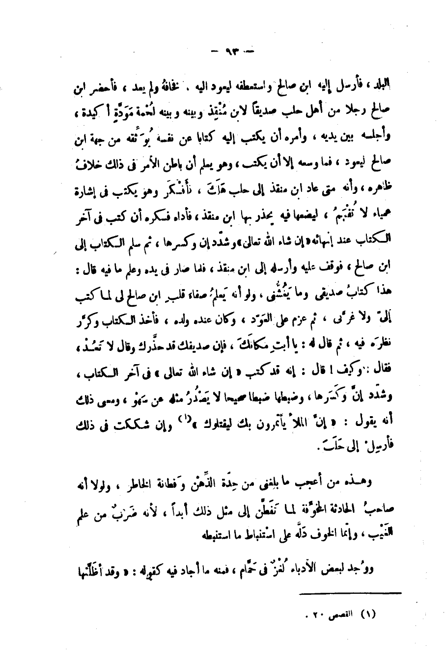 البلد، فأرسل إليه ابن صالح واستعطفه ليعود إليه، فخافه ولم يعد، فأحضر ابن صالح رجلا من أهل حلب صديقا لابن منقذ وبينه وبينه لحمة مودة أكيدة, وأجلسه بين يديه، وأمره أن يكتب إليه كتابا عن نفسه يوثقه من جهة ابن صالح ليعود، فما وسعه إلا أن يكتب، وهو يعلم أن باطن الأمر في ذلك خلاف ظاهره، وأنه متى عاد ابن منقذ إلى حلب هلك، فأفكر وهو يكتب في إشارة عمياء لا تفهم، ليضعها فيه يحذر بها ابن منقذ، فأداه فكره أن كتب في آخر الكتاب عند إنهائه: "إن شاء الله تعالى" وشدد إن وكسرها، ثم سلم الكتاب إلى ابن صالح، فوقف عليه وأرسله إلى ابن منقذ، فلما صار في يده وعلم ما فيه قال: هذا كتاب صديقي وما يغشني، ولو أنه يعلم صفاء قلب ابن صالح لي لما كتب إلي ولا غرني، ثم عزم على العود، وكان عنده ولده، فأخذ الكتاب وكرر نظره فيه: ثم قال له: يا أبت مكانك، فإن صديقك قد حذرك وقال لا تعد، فقال: وكيف! قال: إنه قد كتب "إن شاء الله تعالى" في آخر الكتاب، وشدد إن وكسرها، وضبطها ضبطا صحيحا لا يصدر مثله عن سهو، ومعي ذلك أنه يقول: {إِنَّ الْمَلأَ يَأْتَمِرُونَ بِكَ لِيَقْتُلُوكَ} 1 وإن شككت في ذلك فأرسل إلى حلب.