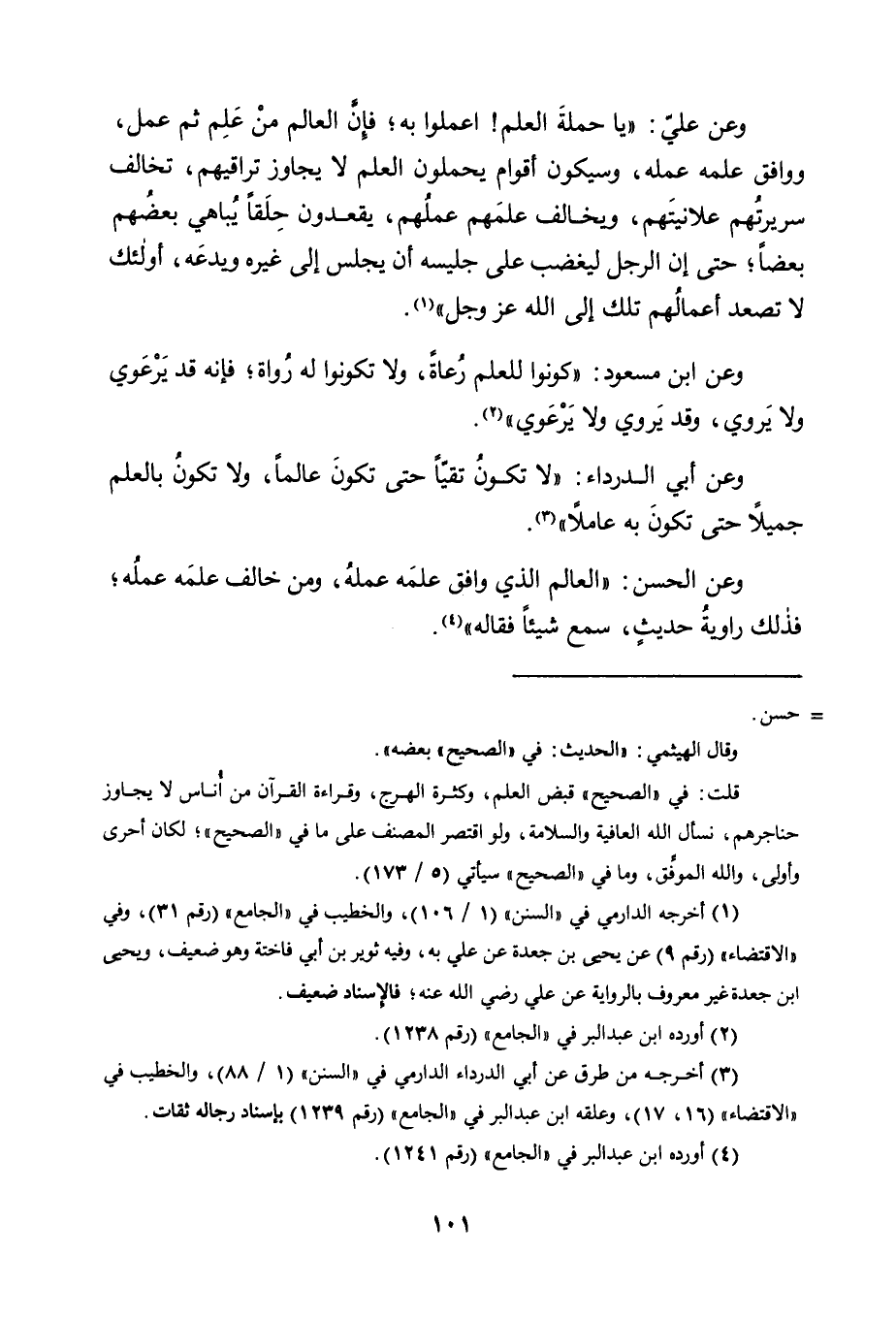 3 أخرجه من طرق عن أبي الدرداء الدارمي في "السنن" "1/ 88"، والخطيب في "الاقتضاء" "16، 17"، وعلقه ابن عبد البر في "الجامع" "رقم 1239" بإسناد رجاله ثقات.