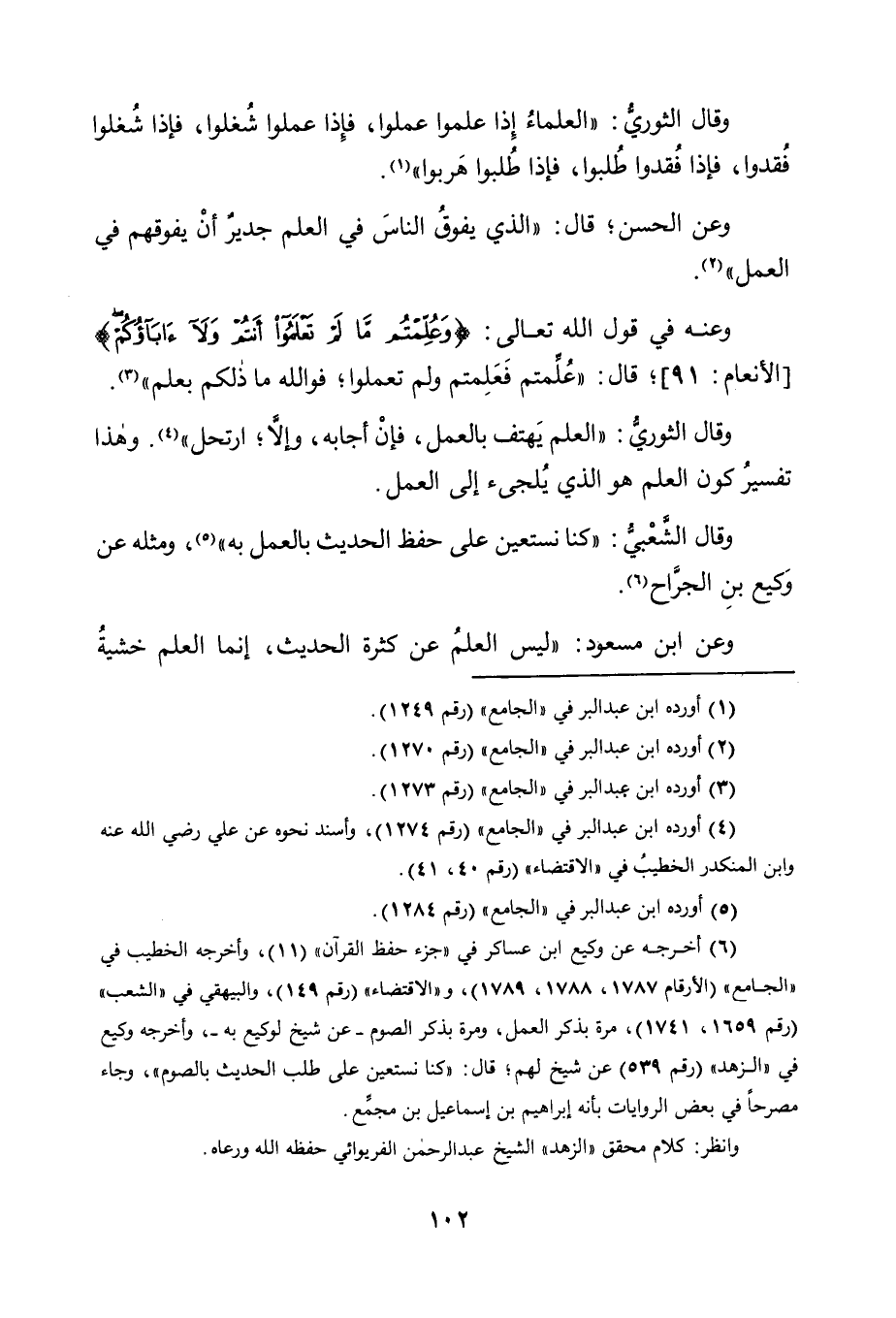 وَقَالَ الثَّوْرِيُّ: "الْعِلْمُ يَهتف بِالْعَمَلِ، فإن أجابه؛ وإلا ارتحل"4. وهذا تفسير كَوْنِ الْعِلْمِ هُوَ الَّذِي يُلجئ إِلَى الْعَمَلِ.