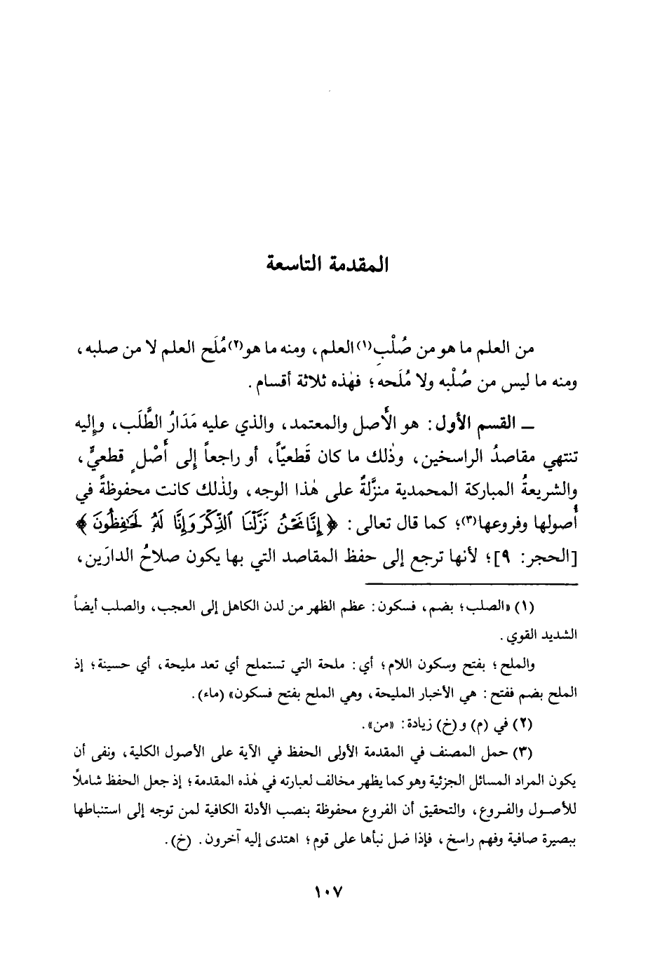 3 حمل المصنف في المقدمة الأولى الحفظ في الآية على الأصول الكلية، ونفى أن يكون المراد المسائل الجزئية وهو كما يظهر مخالف لعبارته في هذه المقدمة؛ إذ جعل الحفظ شاملا للأصول والفروع، والتحقيق أن الفروع محفوظة بنصب الأدلة الكافية لمن توجه إلى استنباطها ببصيرة صافية وفهم راسخ، فإذا ضل نبؤها على قوم؛ اهتدى إليه آخرون. "خ".
