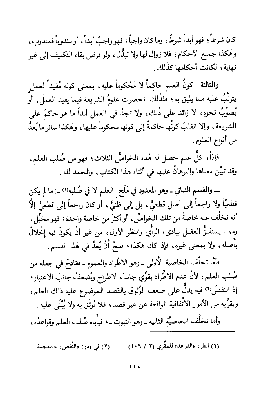 فَإِذًا؛ كُلُّ عِلْمٍ حَصَلَ لَهُ هَذِهِ الْخَوَاصُّ الثَّلَاثُ؛ فَهُوَ مِنْ صُلْبِ الْعِلْمِ، وَقَدْ تَبَيَّنَ مَعْنَاهَا وَالْبُرْهَانُ عَلَيْهَا فِي أَثْنَاءِ هَذَا الْكِتَابِ، وَالْحَمْدُ لِلَّهِ.