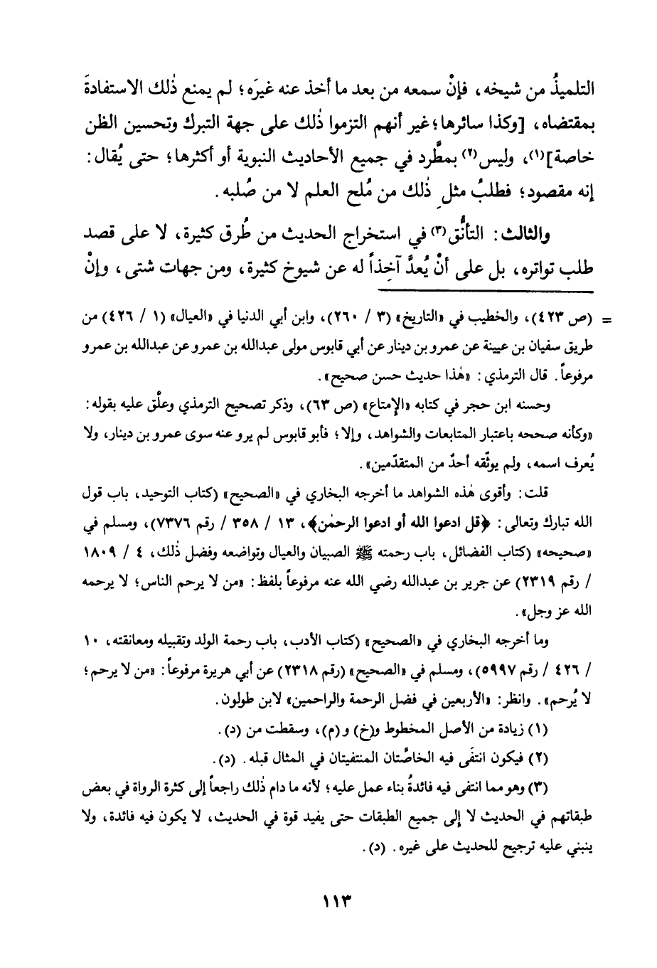 التلميذ من شيخه، فإن سمعه من بَعْدَ مَا أَخَذَ عَنْهُ غَيْرَهُ؛ لَمْ يَمْنَعْ ذلك الاستفادة بمقتضاه، [وكذا سَائِرُهَا؛ غَيْرَ أَنَّهُمُ الْتَزَمُوا ذَلِكَ عَلَى جِهَةِ التَّبَرُّكِ وَتَحْسِينِ الظَّنِّ خَاصَّةً] 1، وَلَيْسَ2 بِمُطَّرِدٍ فِي جَمِيعِ الْأَحَادِيثِ النَّبَوِيَّةِ أَوْ أَكْثَرِهَا؛ حَتَّى يُقال: إِنَّهُ مَقْصُودٌ؛ فَطَلَبُ مِثْلِ ذَلِكَ مِنْ مُلَحِ الْعِلْمِ لَا مَنْ صُلْبِهِ.
