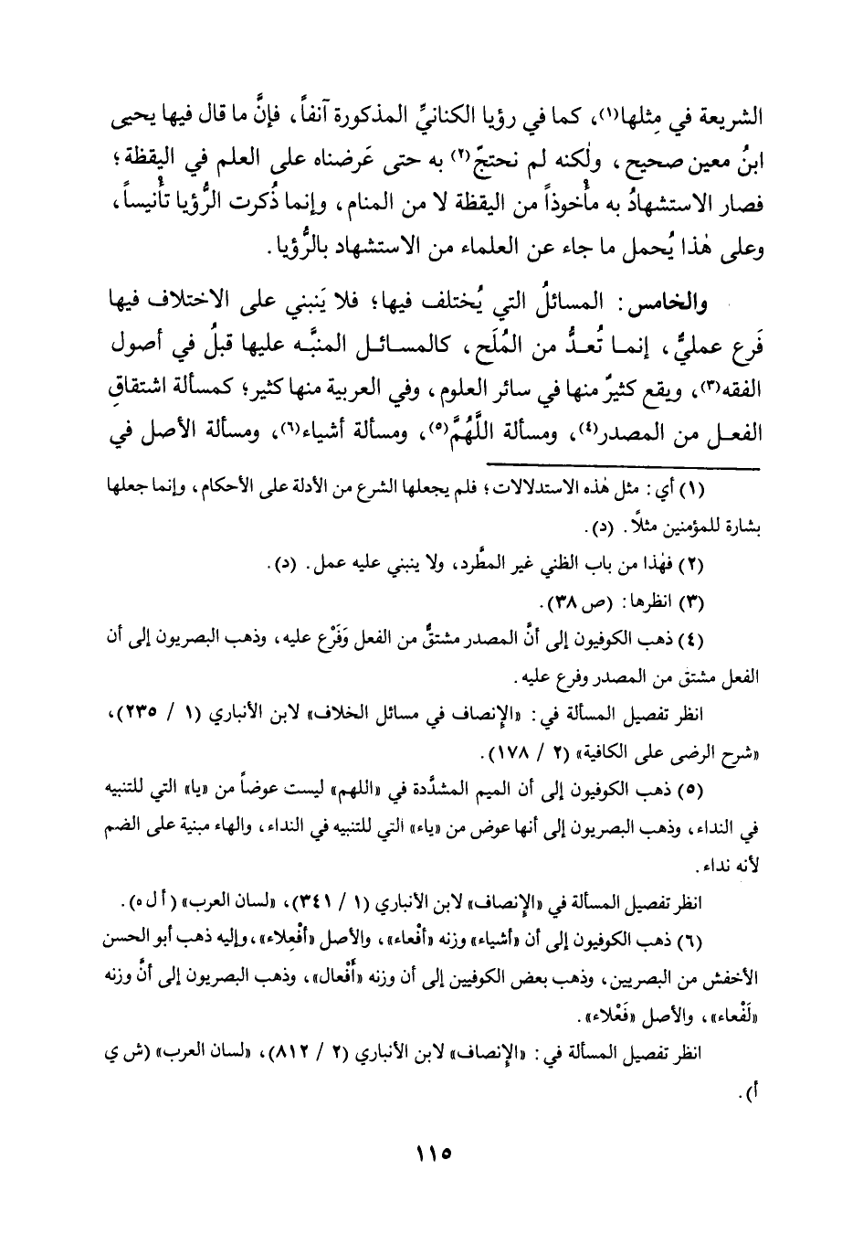 وَالْخَامِسُ: الْمَسَائِلُ الَّتِي يُختلف فِيهَا؛ فَلَا يَنْبَنِي عَلَى الِاخْتِلَافِ فِيهَا فَرْعٌ عَمَلِيٌّ، إِنَّمَا تُعَدُّ مِنَ الْمُلَحِ، كَالْمَسَائِلِ الْمُنَبَّهِ عَلَيْهَا قَبْلُ فِي أُصُولِ الْفِقْهِ3، وَيَقَعُ كَثِيرٌ مِنْهَا فِي سَائِرِ الْعُلُومِ، وَفِي الْعَرَبِيَّةِ مِنْهَا كَثِيرٌ؛ كَمَسْأَلَةِ اشْتِقَاقِ الْفِعْلِ مِنَ الْمَصْدَرِ4، وَمَسْأَلَةِ اللَّهُم5، ومسألة أشياء6، ومسألة الأصل في